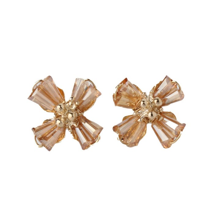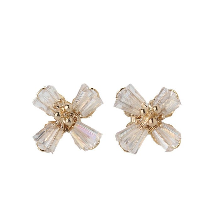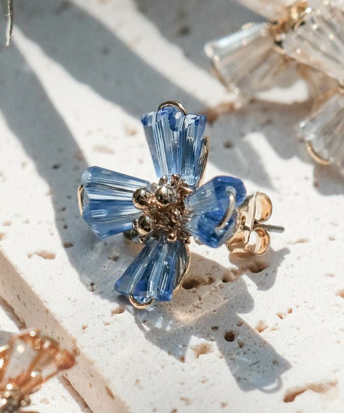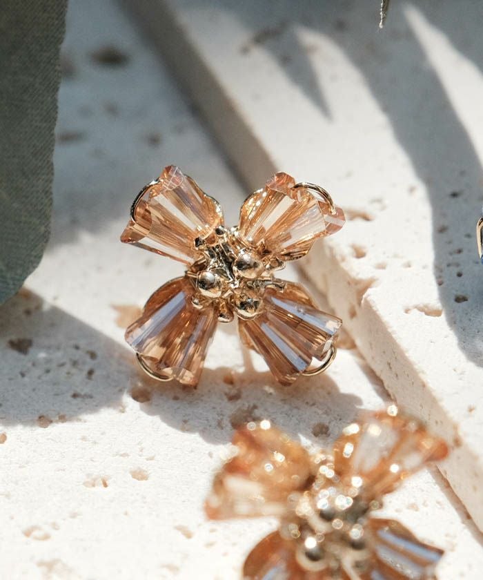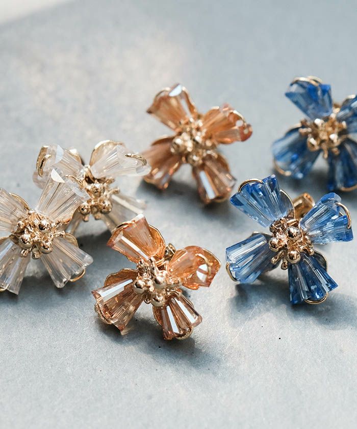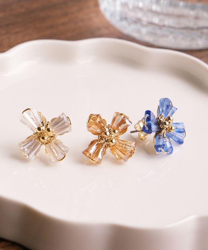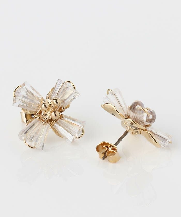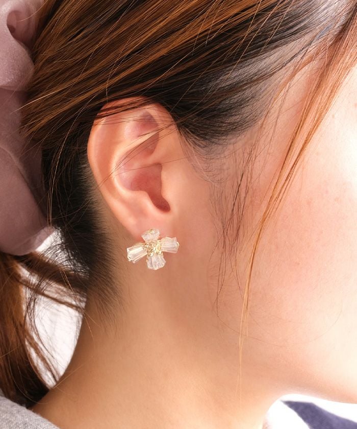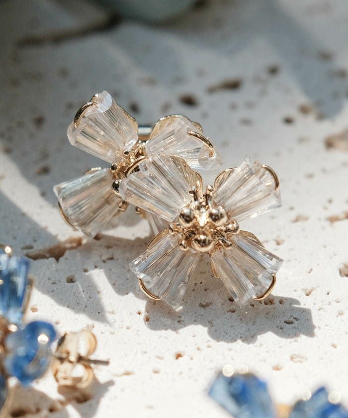 柔らかく広がる花びらモチーフに、クリスタルの透明感を添えたフェミニンなデザインピアス。