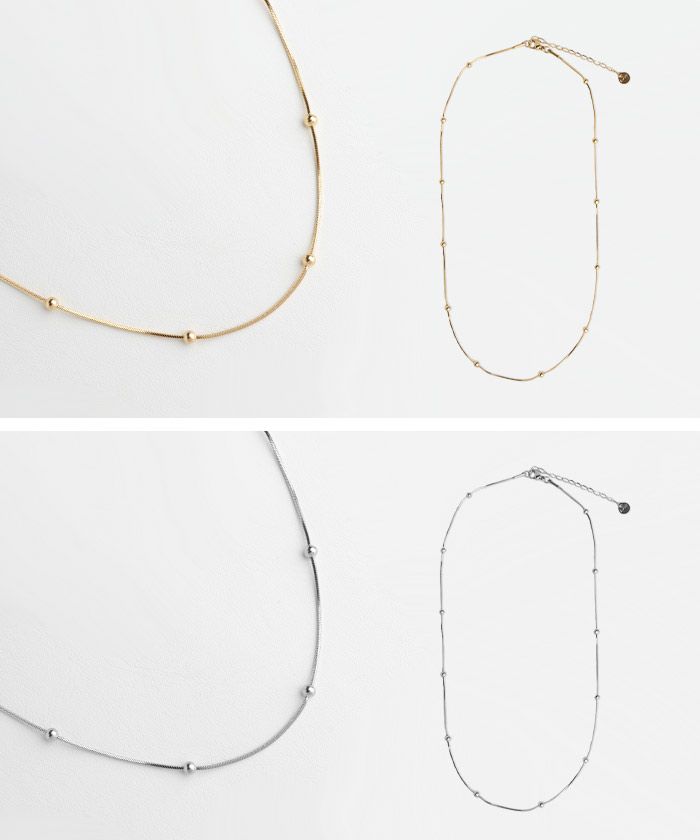 • 小さなメタルボールが等間隔に連なったネックレス。オンオフつけっぱなしできるデザインで、重ね付けなどのアレンジも楽しめる1本です。