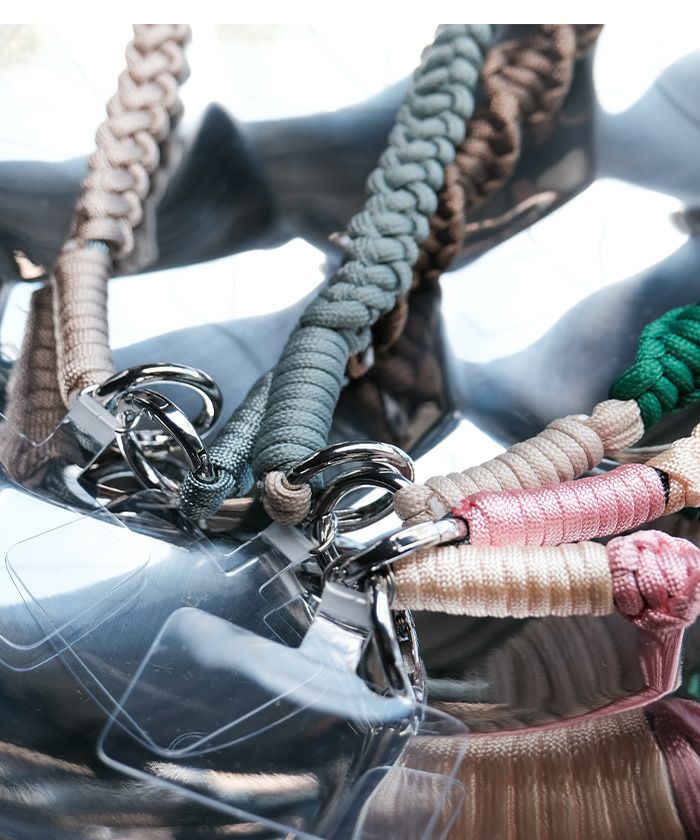 カラビナタイプの金具で、スマホケースやミニバッグなどに簡単に取り付けられるのも魅力のひとつ。