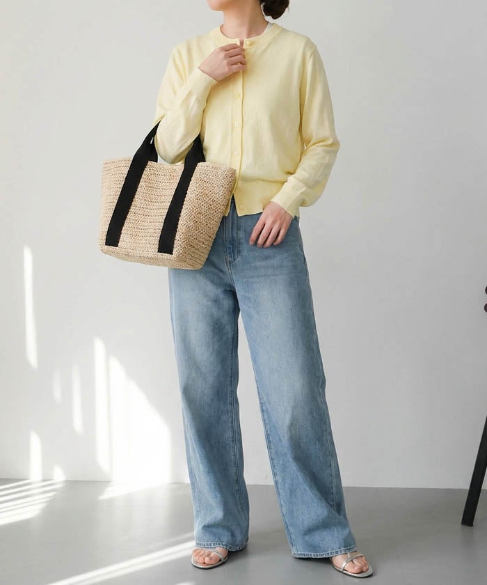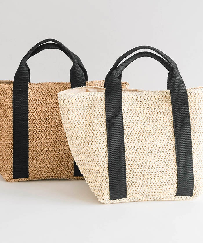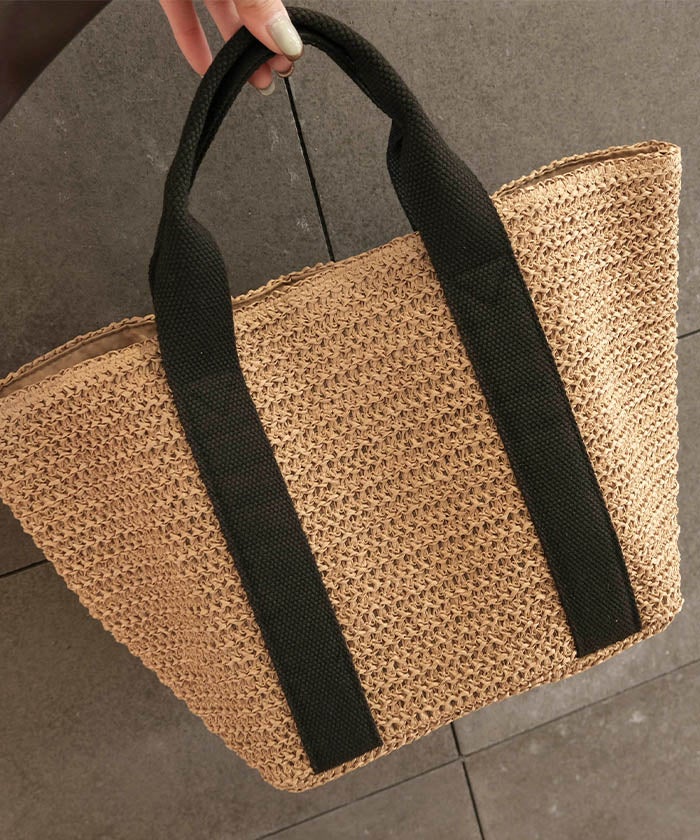 ナチュラルな雰囲気を楽しめる雑材素材を使用した、シーズンムードたっぷりのテープハンドルトートバッグ。