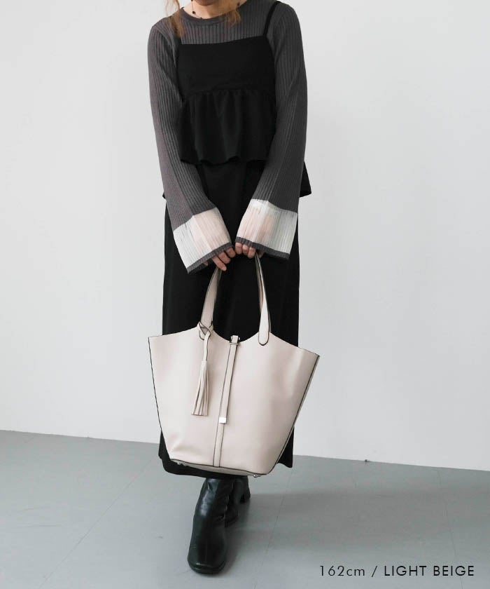 内側には小物を整理しやすいポケットを備え、バッグの中で迷子になりがちな鍵やスマートフォンもすっきり収納可能です。