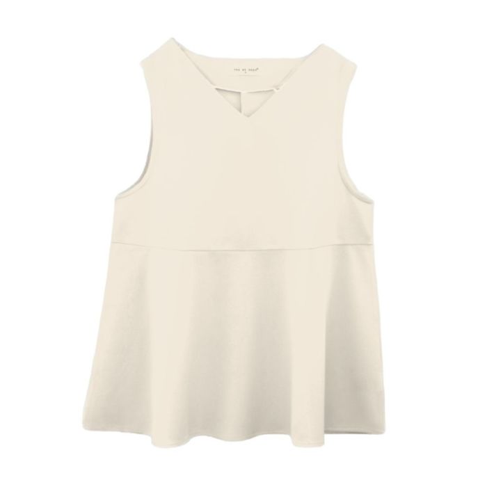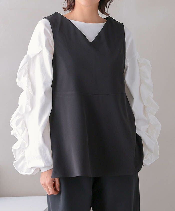 • スリーシーズン使える、ゆるやかな広がりのペプラムベスト