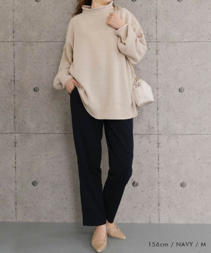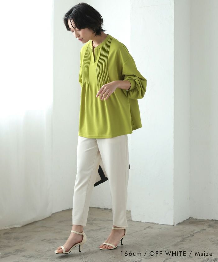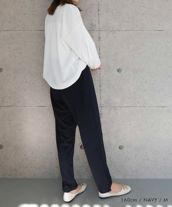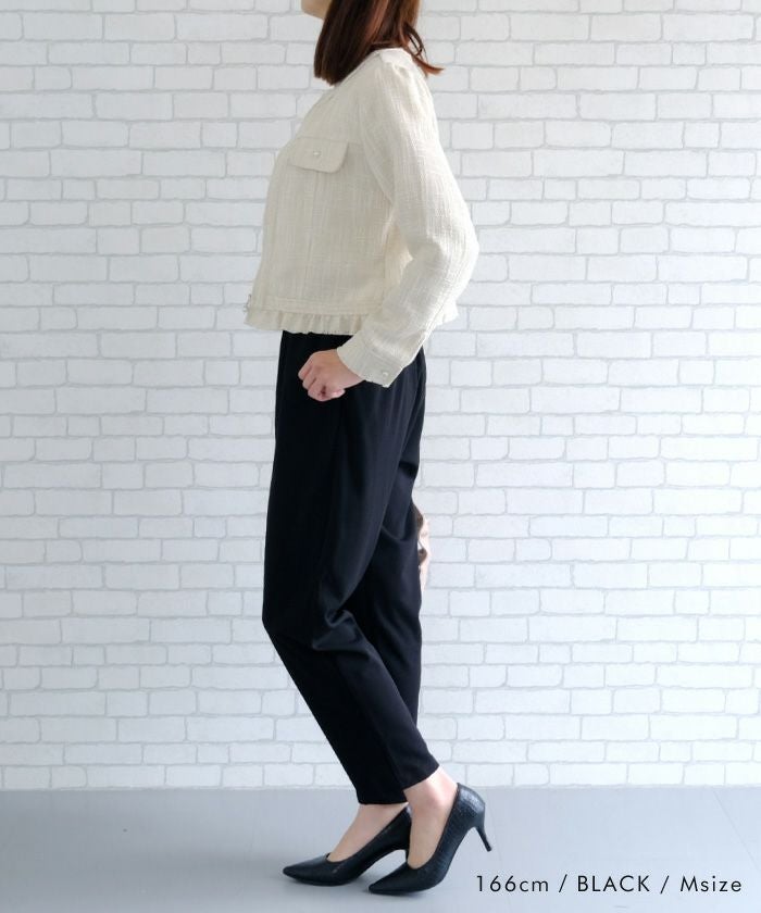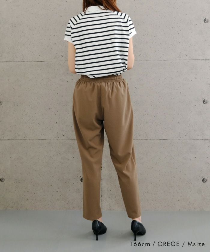 脚をすっきり見せてくれるテーパードラインと、前タックの立体感がポイント。