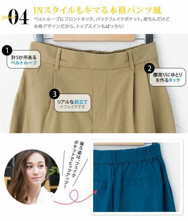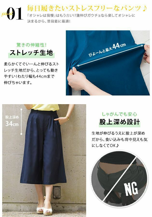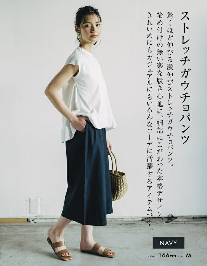 伸縮性が高く、ウエストゴムで楽な穿き心地のガウチョです。