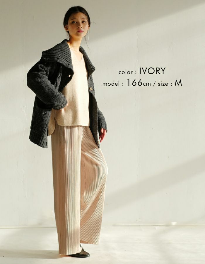 • 角度によって表情を変える光沢が美しいベロア素材で、立体的なヒダが特徴のアコーディオンプリーツ仕様。 リラクシーな中にも洗練さを演出してくれるアイテム。