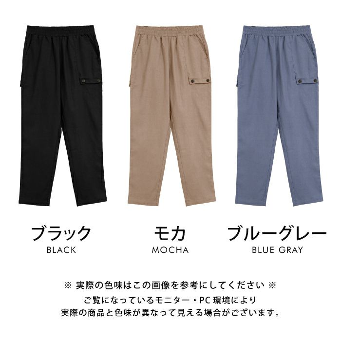 リネン混のサラッとした穿き心地のクロップドテーパードパンツ。 ウエスト部分は、総ゴムになっているので穿きやすく楽ちんです。 シンプルなので幅広いコーデに活躍するアイテムです。