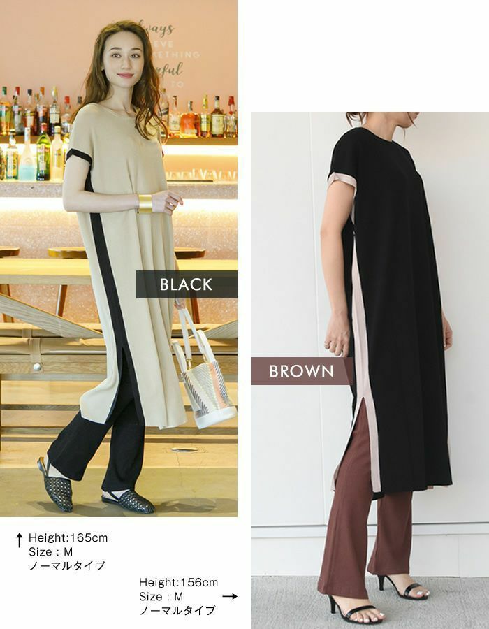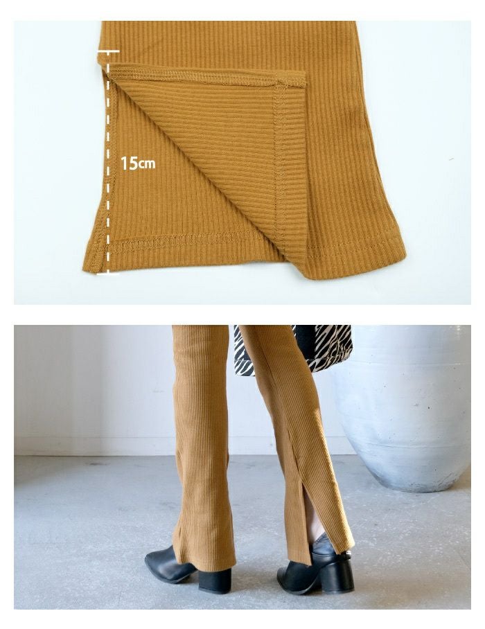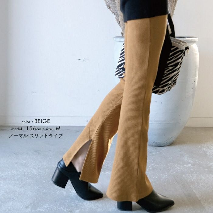 ブーツカット風のラインで脚長効果と細見えが魅力的な リブニットパンツ。ノーマル生地タイプ/裏起毛生地タイプ/スリットなし/スリットありの4タイプあるのでオールシーズン大活躍。動きやすい素材でママにもおススメの一枚です。