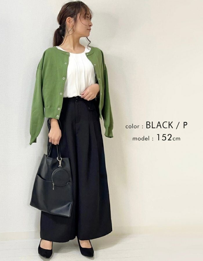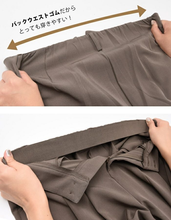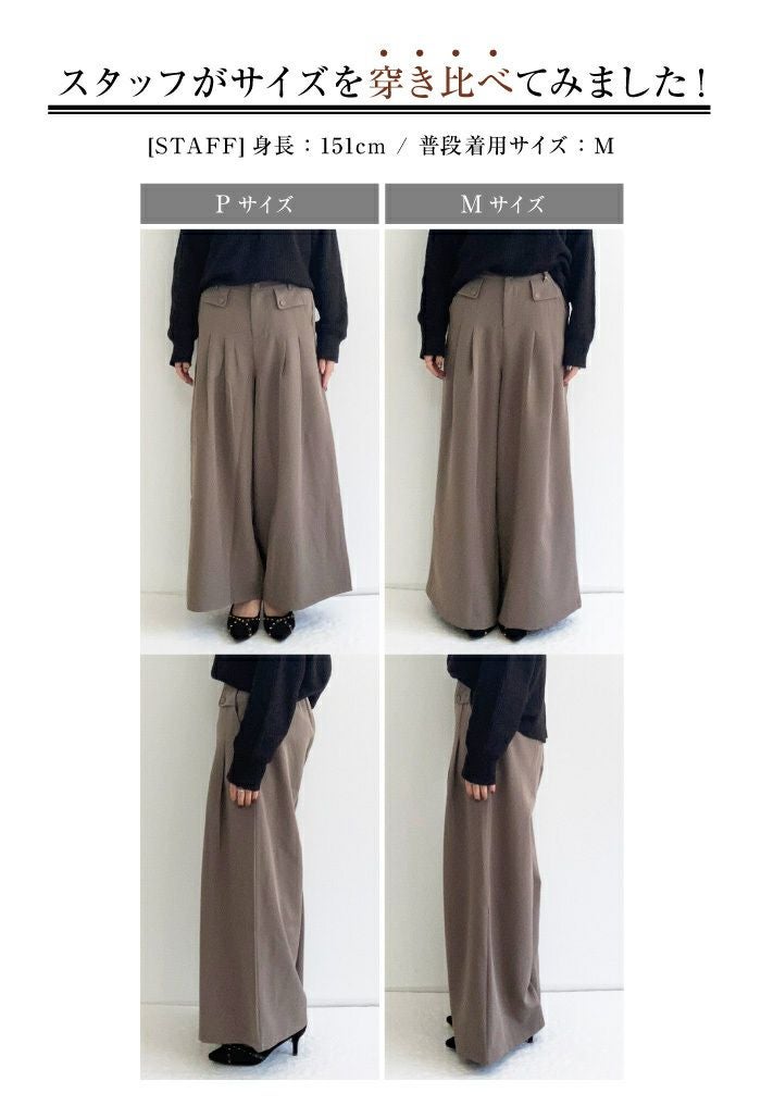 骨格ストレート/153cm55kg 昨年12月に出産し、夏でも動きやすくなるべく涼しいボトムを 探していて、こちらはウエストゴム、タックもモモあたりから なので、モモや腰、お尻のの張りに影響なさそうだと購入しました。 着用は思った通りで、腰回りがスッキリ見えます。 Pサイズはウエストなどが小さい為、Lを購入しましたが やはり着丈が長いです。 こればかりは好みかもしれませんが、ぺたんこ靴ですし ウエスト位置によっては引きずります。 ので、お直しに出す予定です。 また、バックはポケットなど無いためお尻の存在感が凄いです…。 それでも、とても楽ちんなので沢山着たいと思います。 出来れば、P/Mサイズと同じようにP/Lサイズも作って欲しいです!