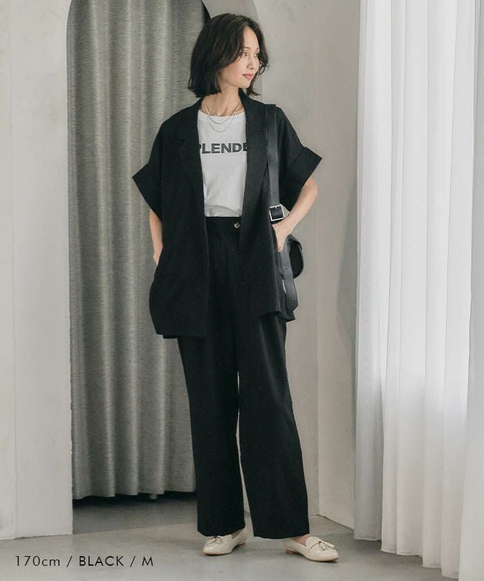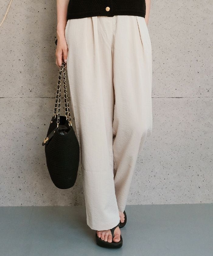 ゆとりのあるワイドストレートシルエットで、脚のラインを拾いにくく、すっきりとした印象に仕上がります。