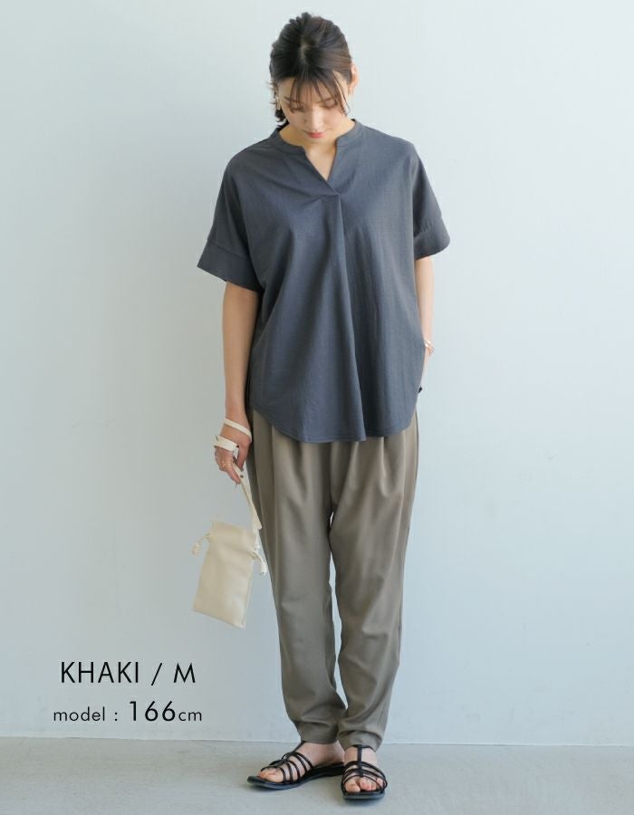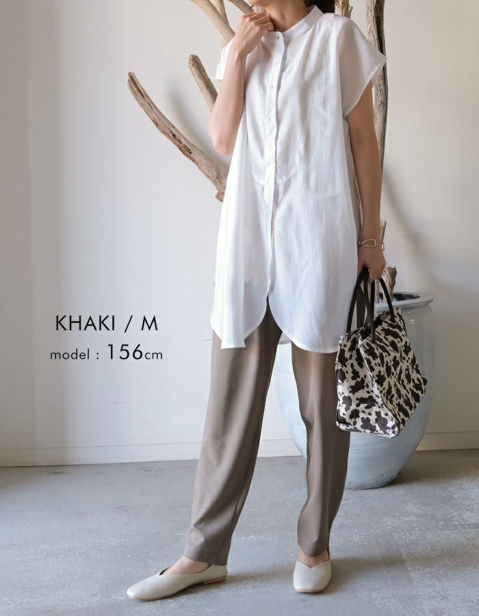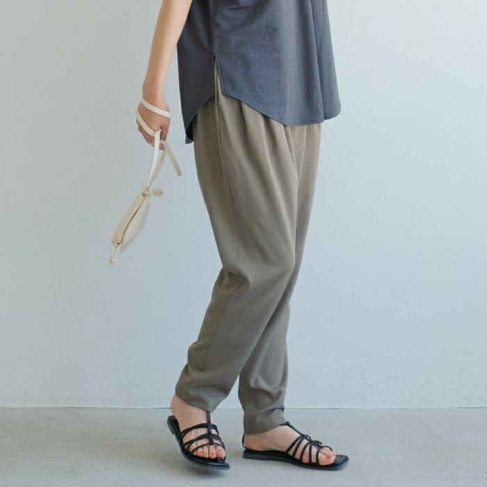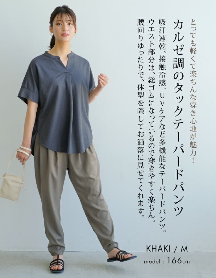 吸汗速乾、接触冷感、UVケアなど多機能なテーパードパンツ。 ウエスト部分は、総ゴムになっているので穿きやすく楽ちん。 腰回りゆったりで体型を隠してお洒落に見せてくれます。