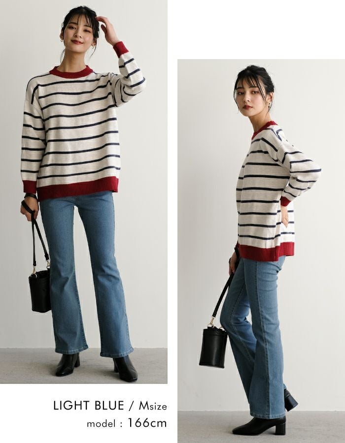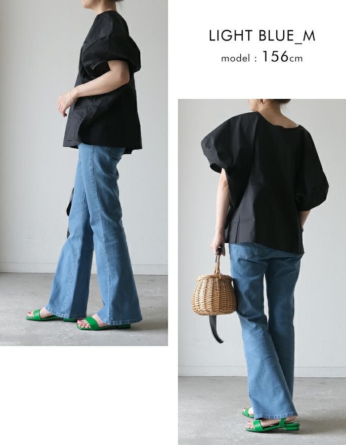 程よいフレアで脚を長く綺麗に見せてくれるデニムパンツ。 ウエスト部分は、後ろがゴムになっているので穿きやすく楽ちん。 伸縮性のある生地で、ストレスフリーな着心地を叶えます。