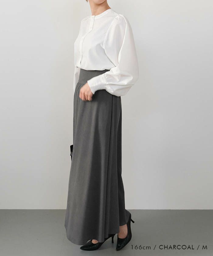 • 贅沢に広がるフレアシルエットと、動くたびふわりとなびくボリューム感がポイントのスカートです。