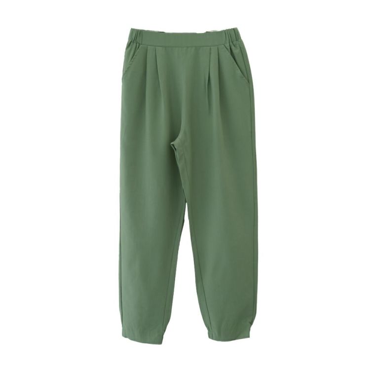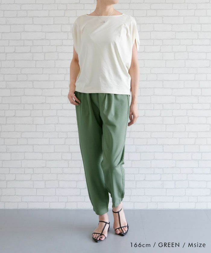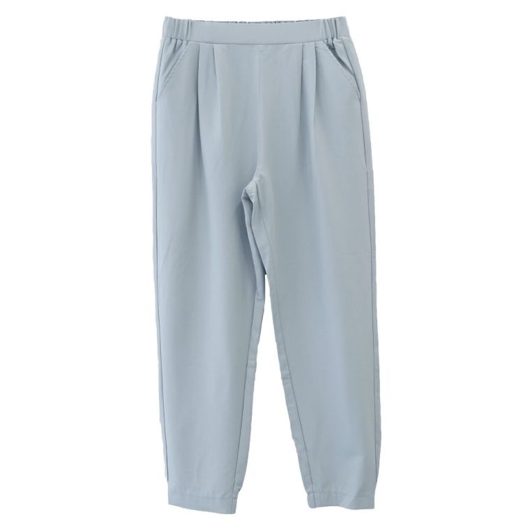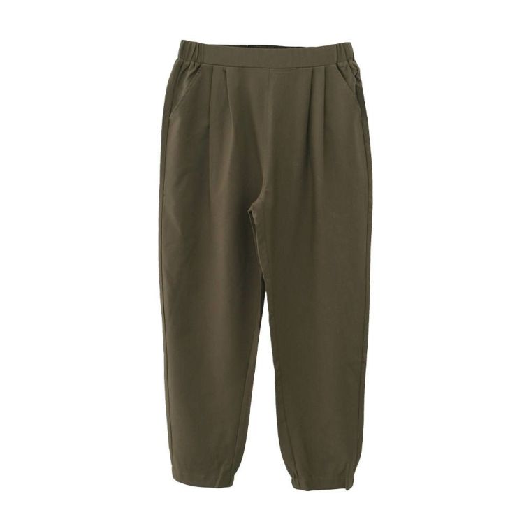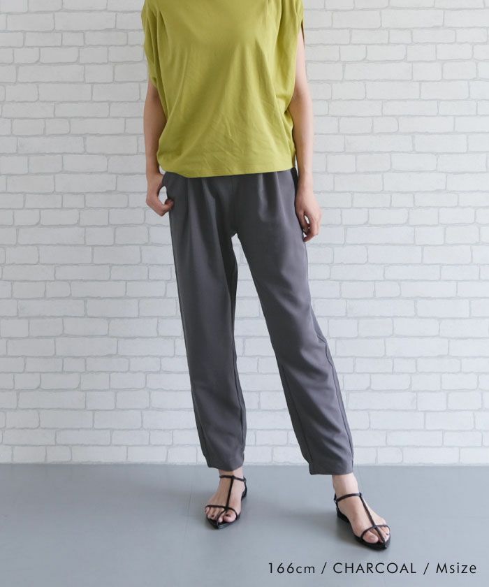 フロントのタックが腰まわりを自然にカバーし、脚をまっすぐきれいに見せてくれるジョガーパンツ。