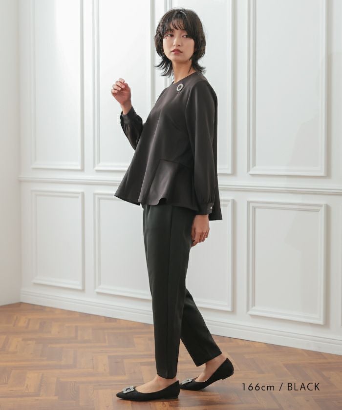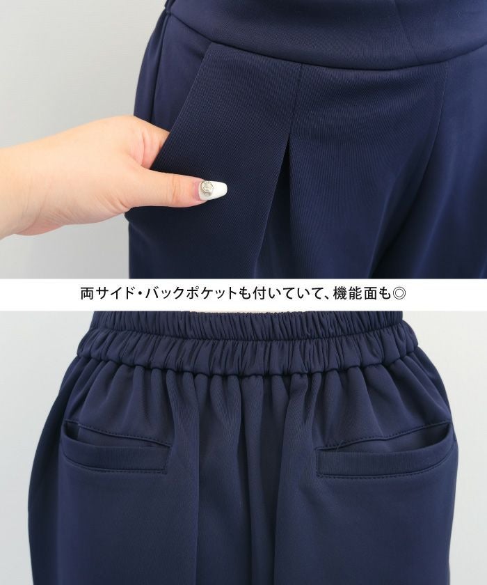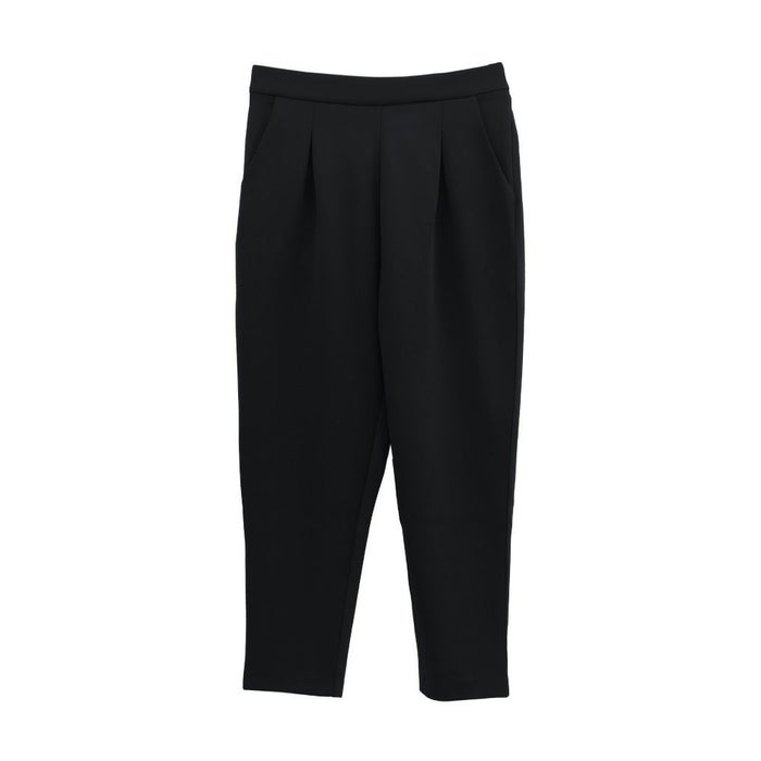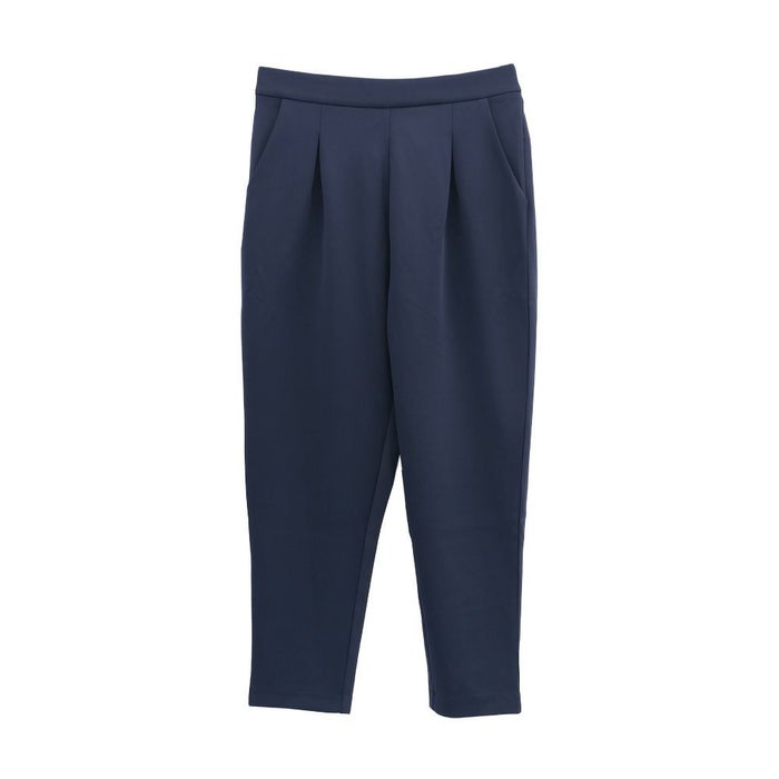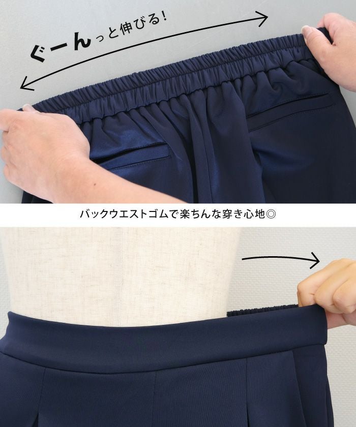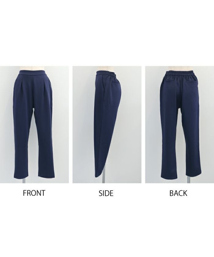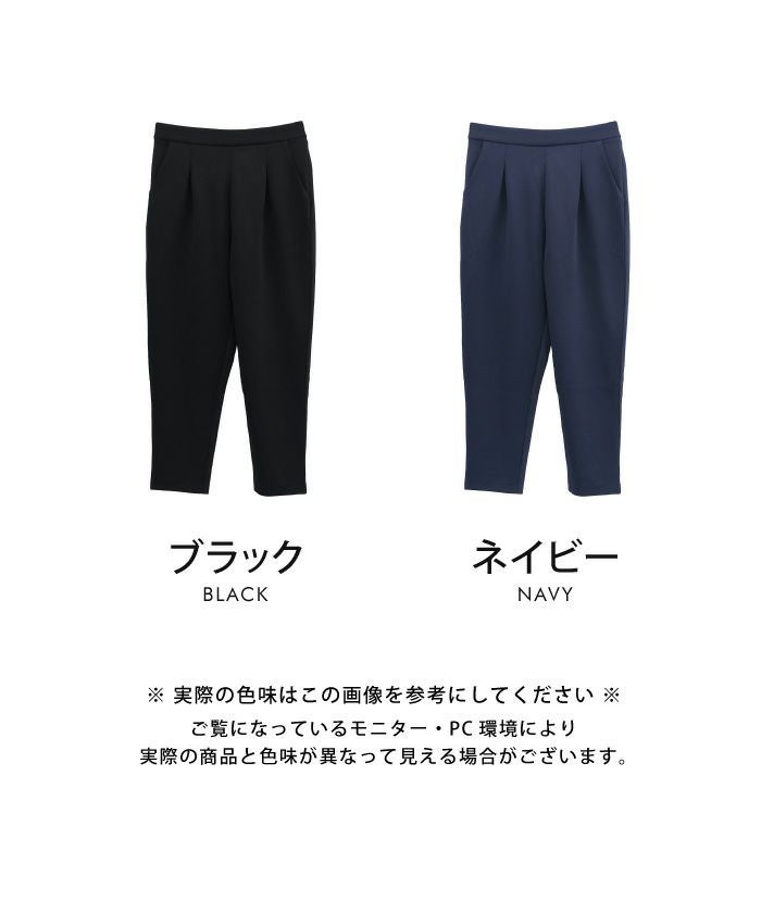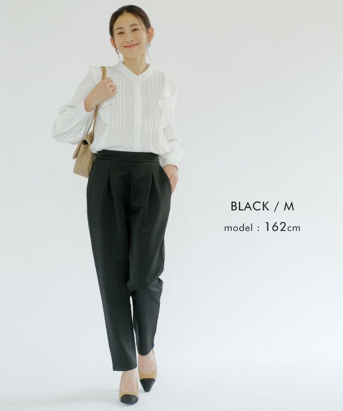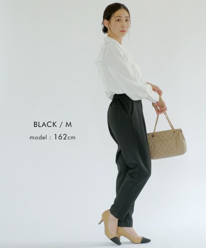 長時間穿いても疲れないストレスフリーなテーパードパンツ。 ウエストはバックゴム仕様で動きやすく、 オフィスにはもちろん、リモートワークにも使える優秀な一枚。