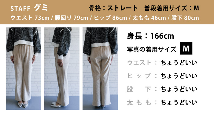 ヒップや太もも周りはゆったりと、膝下にかけて自然に広がるシルエットで、脚長効果も抜群です。
