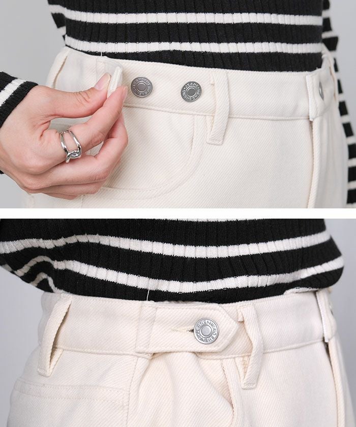 脚のラインを拾いすぎないストレートシルエットが、自然に美脚を演出。