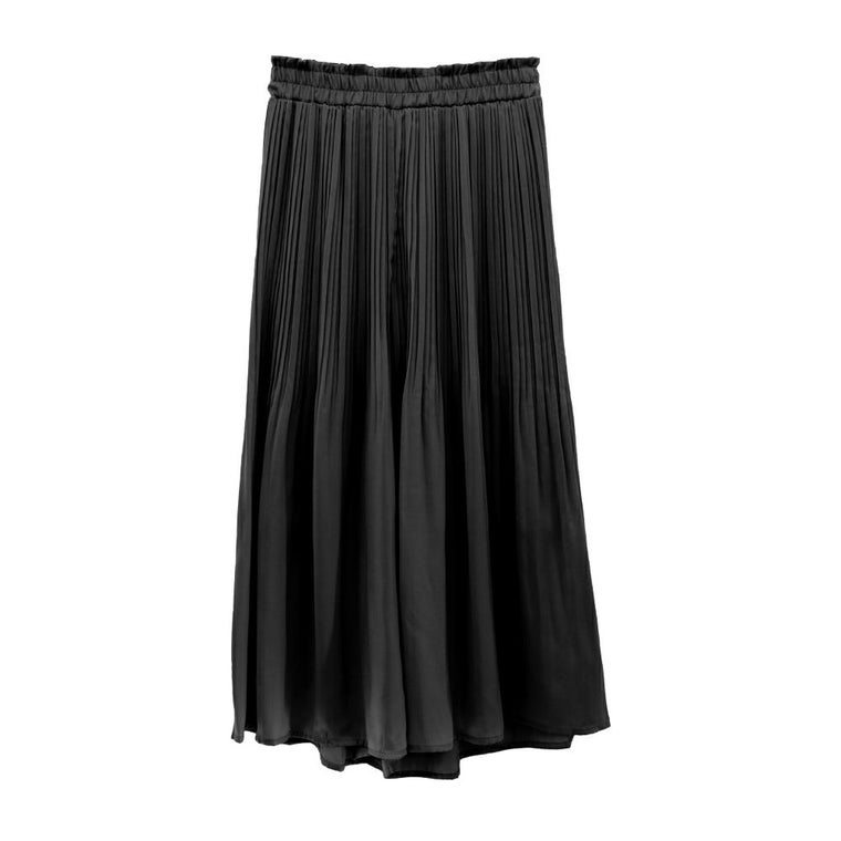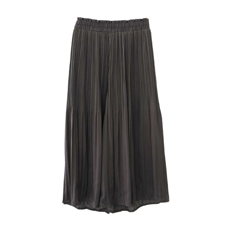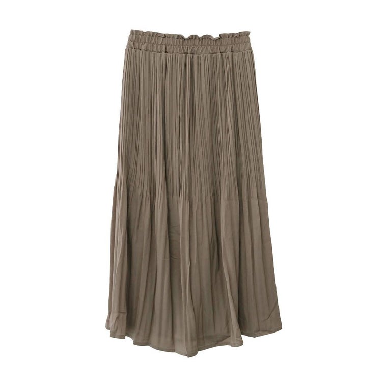 程よいフレアなシルエットと上品な丈感のプリーツパンツ。 裾は消しプリーツになっていて、ふわりと抜け感のある仕上がりに。 ウエスト部分は、総ゴムになっているので穿きやすく楽ちん♪ 膝まで裏地があるのでショーツの透け感も気にせず着られます。 シンプルなので幅広いコーデに活躍するアイテムです。