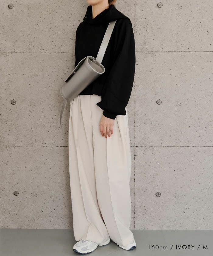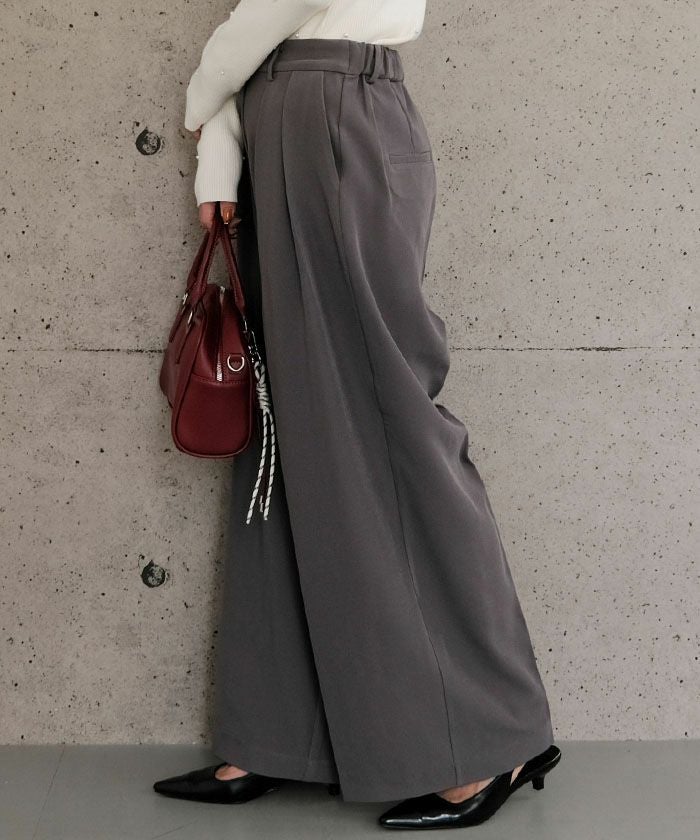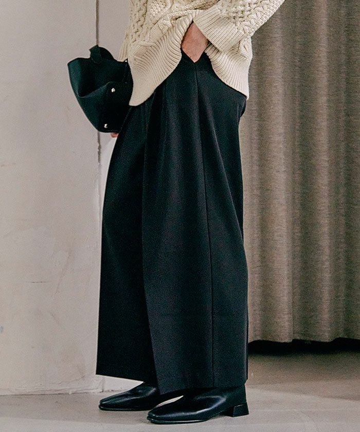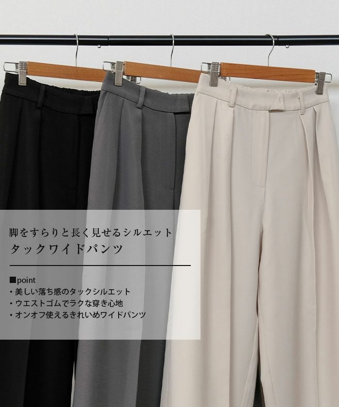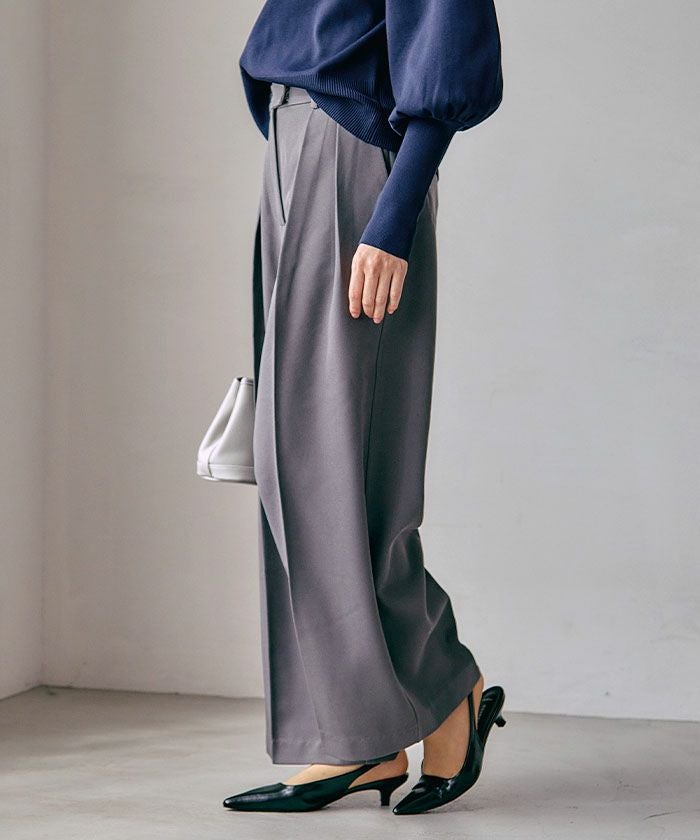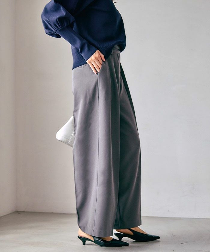 フロントに施したタックがほどよい立体感を生み出し、気になる腰回りや太ももをすっきりカバーしてくれるワイドパンツ。