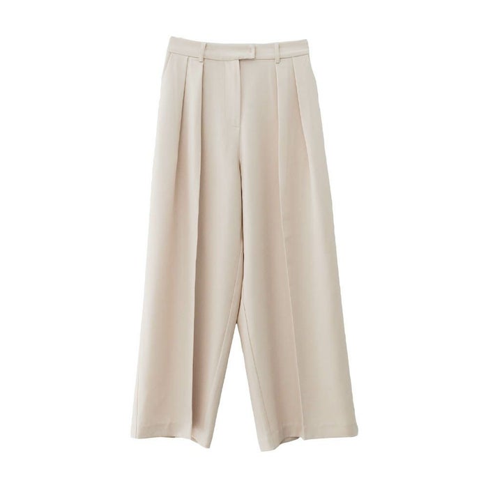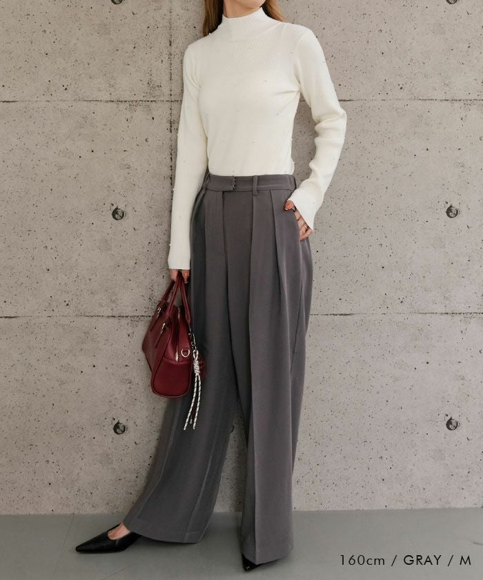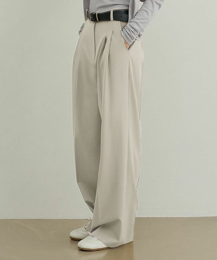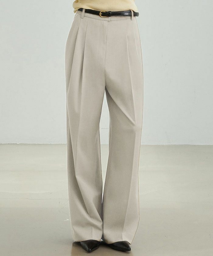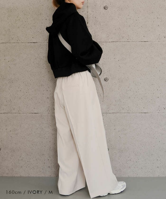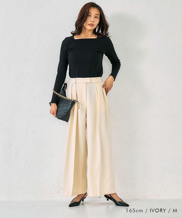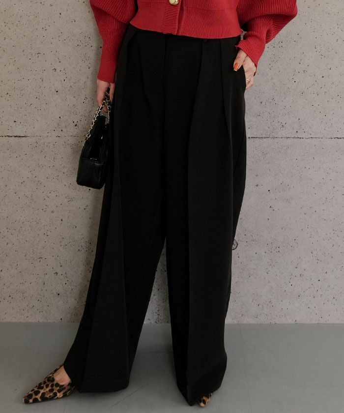 フロントに施したタックがほどよい立体感を生み出し、気になる腰回りや太ももをすっきりカバーしてくれるワイドパンツ。