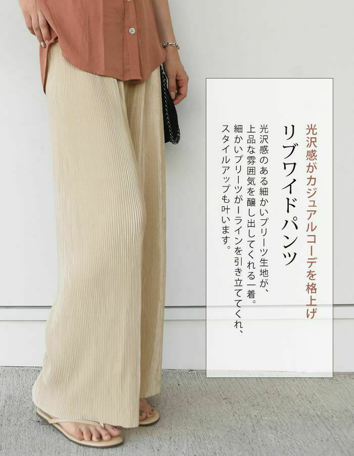 • 光沢感がカジュアルコーデを格上げ!セルフカットリブワイドパンツ。
