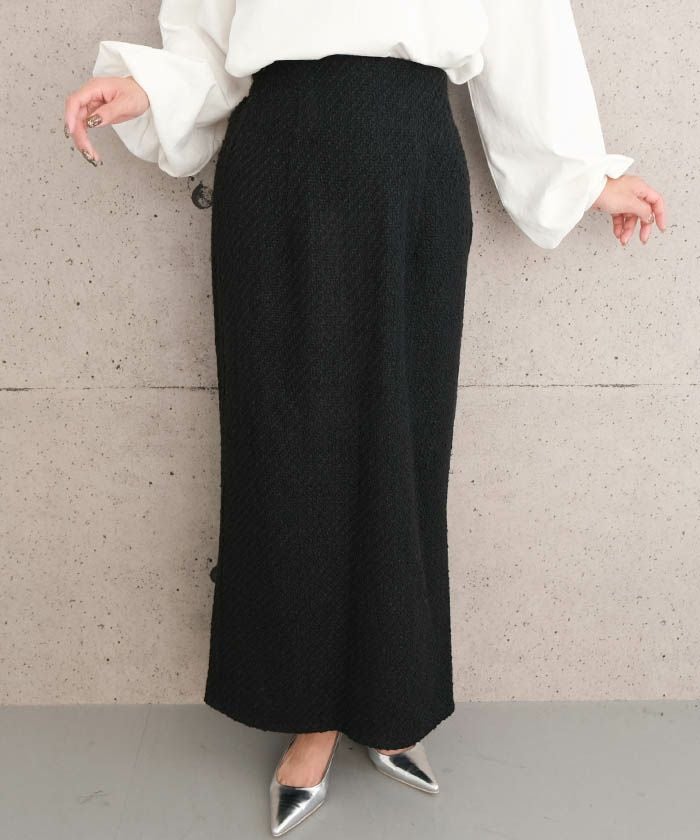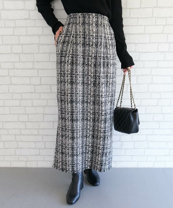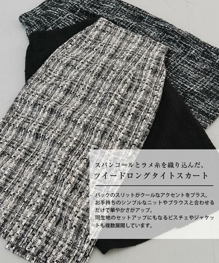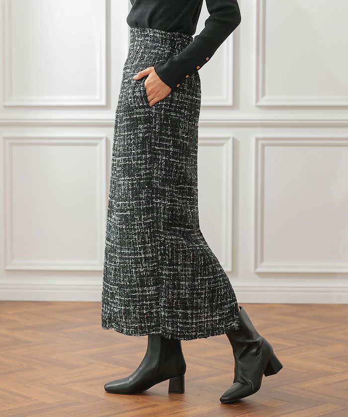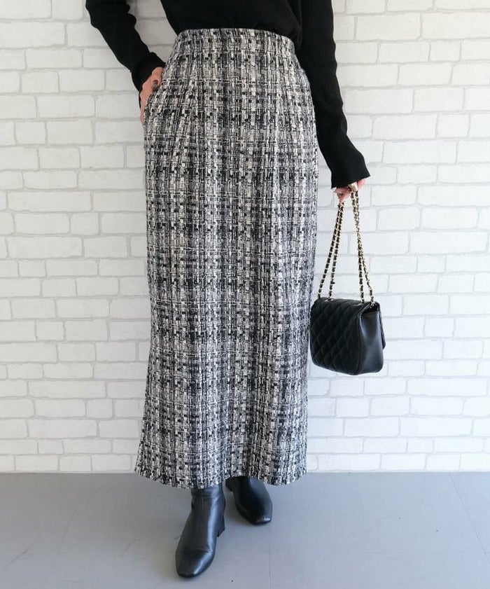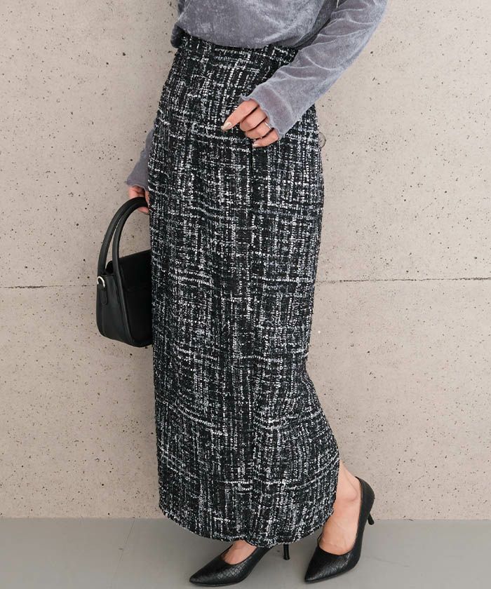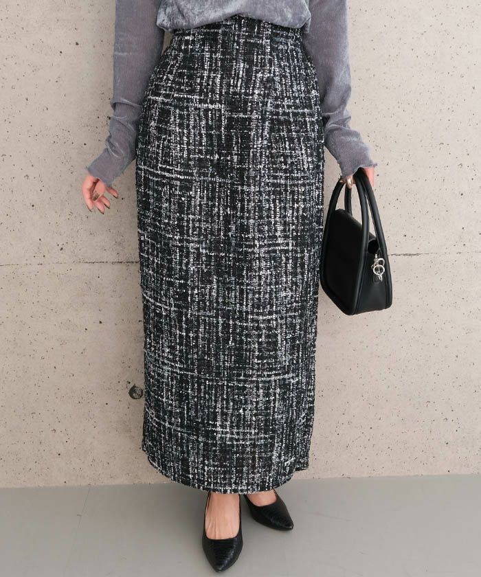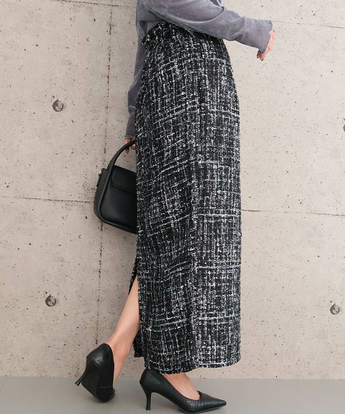 • スパンコールとラメ糸を織り込んだ、表情豊かなツイードのロング丈タイトスカート。