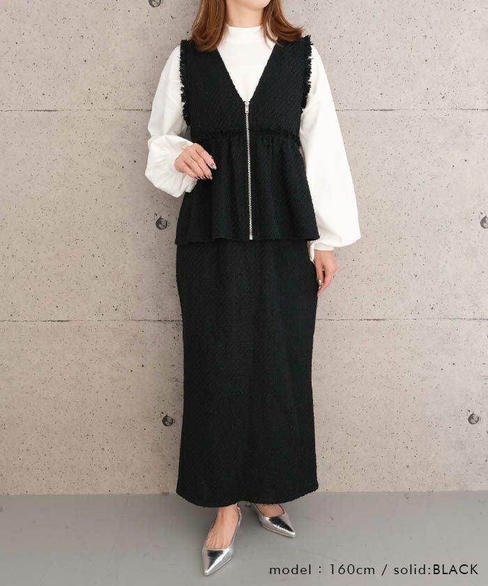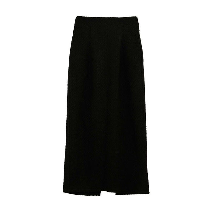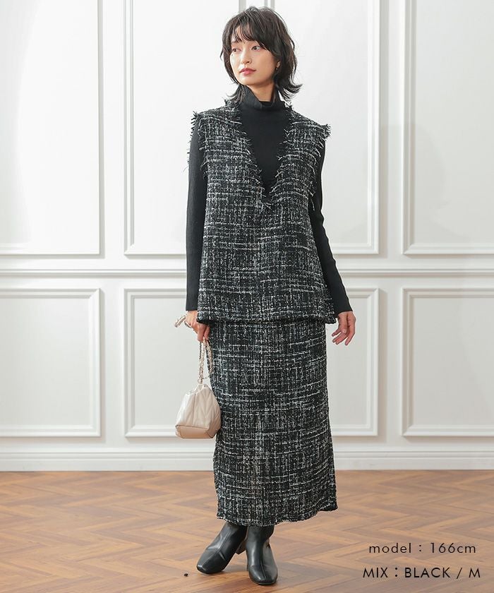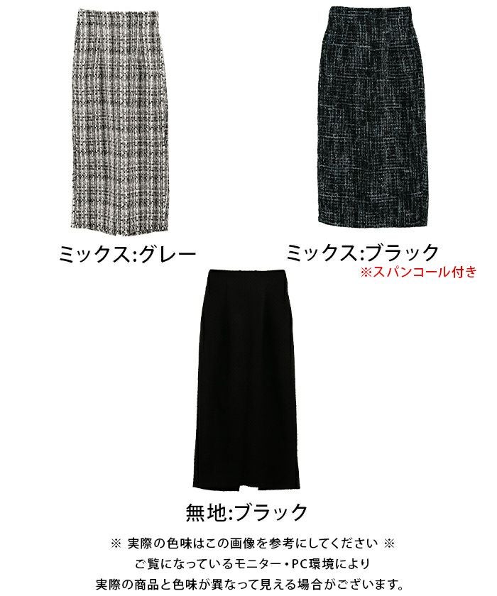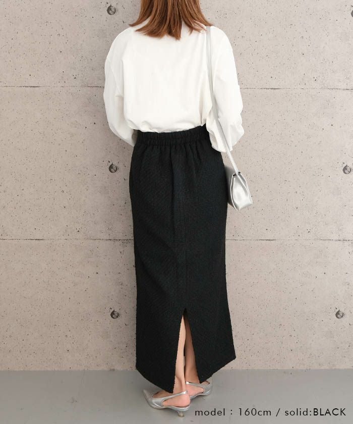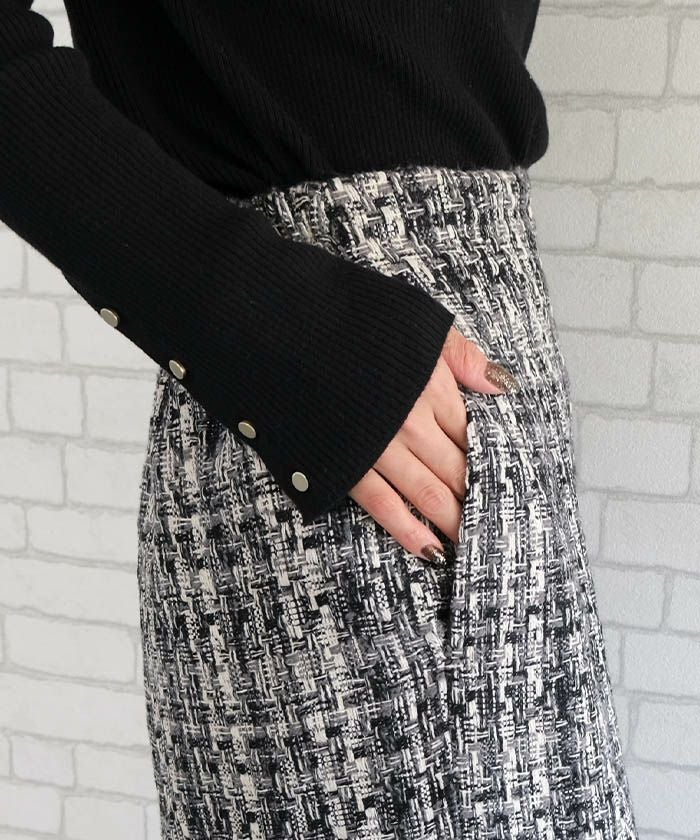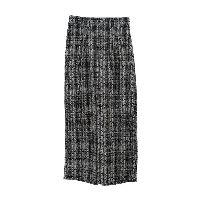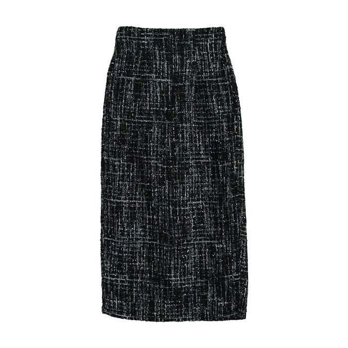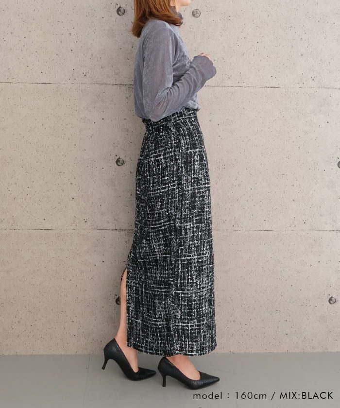 • スパンコールとラメ糸を織り込んだ、表情豊かなツイードのロング丈タイトスカート。