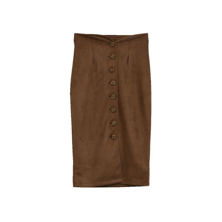 ハイウエストデザインで脚長効果抜群。ウエストタックで“くびれ”をメイク。フロント部分は一列に並ぶボタンによってくびれメイクをさらに際立たせてくれて、スラリと美しい印象に。 滑らかなピーチスキン素材でリッチ感のあるタイトスカート。 タイトさが色っぽい印象を与え、ピーチスキン素材が上品さをプラス。普段使いからオフィスまで幅広く着まわせる上品スカートです。