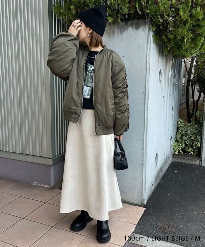 生地もしっかりしていてツヤもあるので、高見えします。 適度に広がるフレアも上品で良い感じです。 スエード調なので、汚れがつきやすいと感じました。 ウエスト部分がゴムではないので、私には大きかったため生地の重みで下に引っ張られます。せめて後ろ部分だけゴムになれば、着用後も綺麗に着用できるだろうと思います。 今の状態では、トップスをウェストインでは履けません。