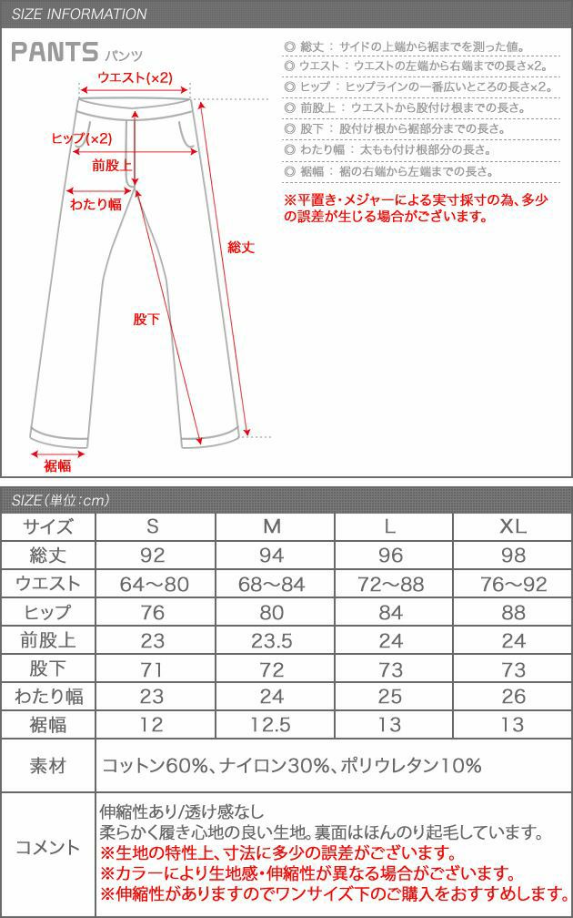 161cm、50キロで普段Mサイズか61~64cmのウエストです。買ってみたらかなり生地が薄く、ウエストにすごく余裕があります。伸縮性があるので脱げることはないと思うけど、ベルトがあった方がいい感じの余裕あり。丈はちょうどいいけど、Sでも良かったかも。肌寒くなってきた秋口にはいいかもしれません。真冬は履けないと思います!