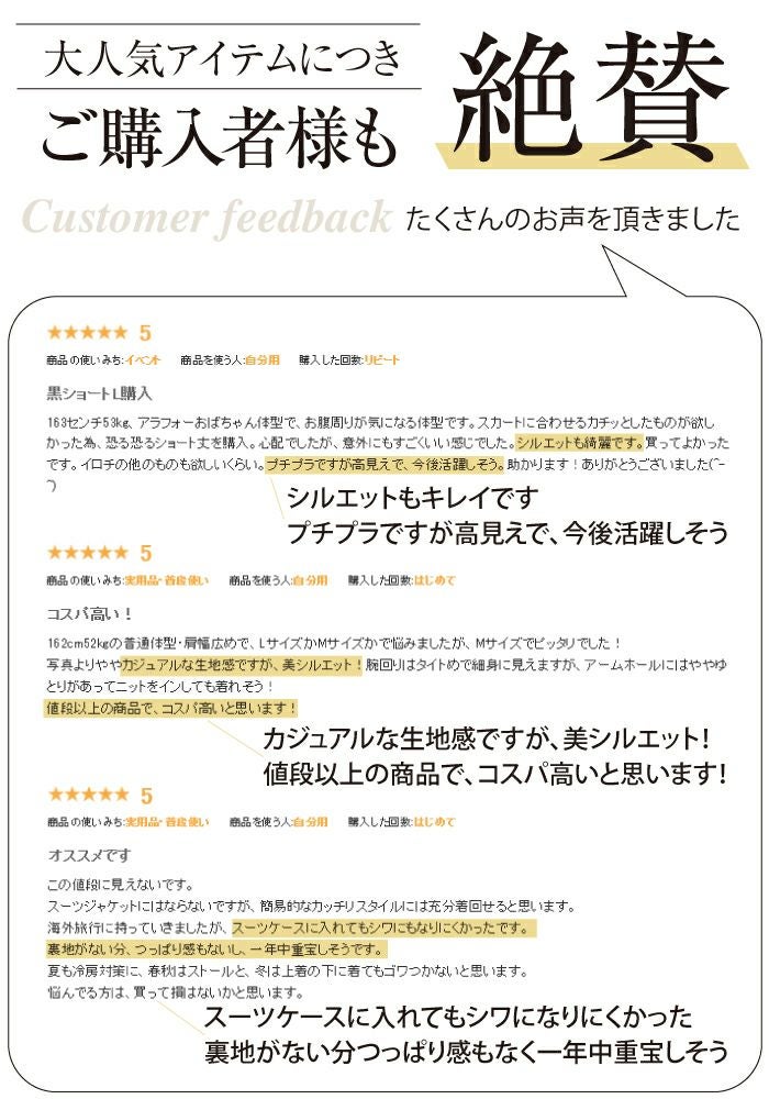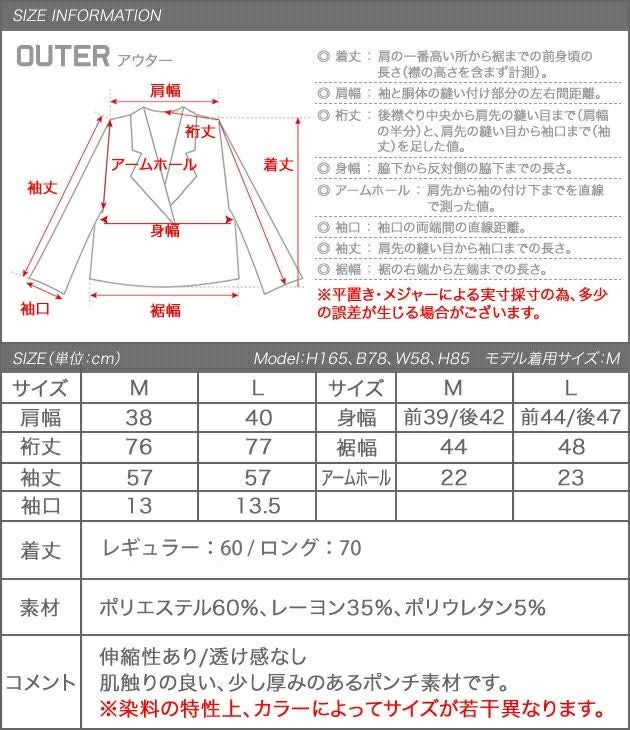 ブラックを購入しました。太めなのでなかなか入るジャケットがなかったのですが、こちらは難なく着ることができました!カジュアルでもオフィスでもどちらも合わせやすく、とても気に入っています!