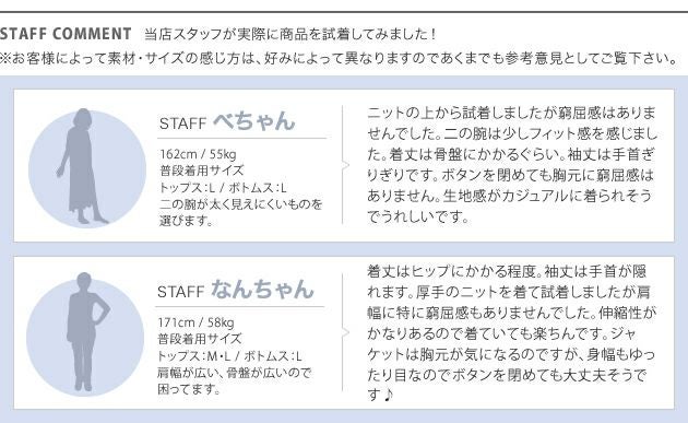 こういうジャケットが欲しくて探してました。 ロングとショートでギリギリまで悩んだのですがロングにして正解でした。 もう少し暖かくなって着るのが楽しみです。 ショップの方の対応も素晴らしかったです(≧∀≦) 確認メールも下さり発送も素早くてあっと言う間に手元に届きました。 梱包も満足です。 主婦なので頻繁に購入はできませんがまたよろしくお願いします。