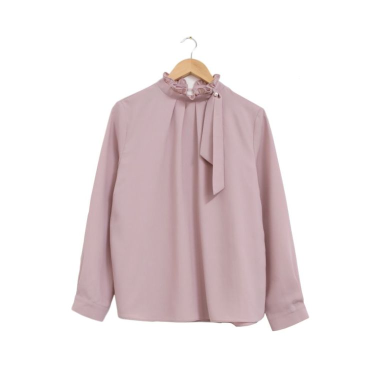 顔まわりを華やかに見せるフリルスタンドカラーが魅力のブラウス。