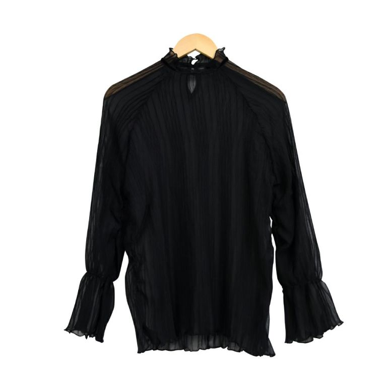 透け感がありながらもハイネックとフレアの袖で上品に甘くなりすぎない大人な一枚です。