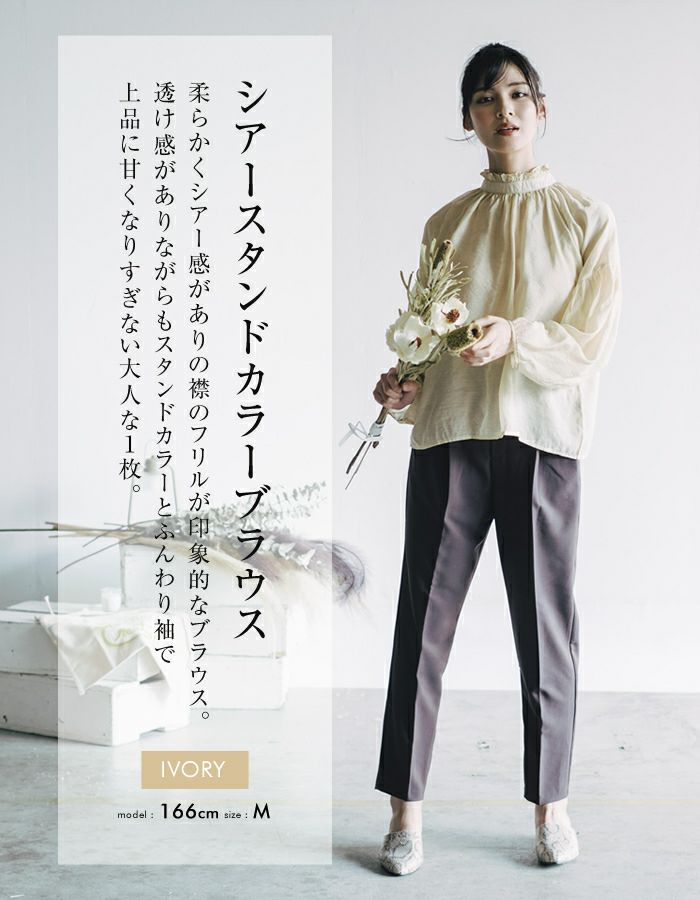 透け感がありながらもスタンドカラーとふんわり袖で 上品に甘くなりすぎない大人な1枚。