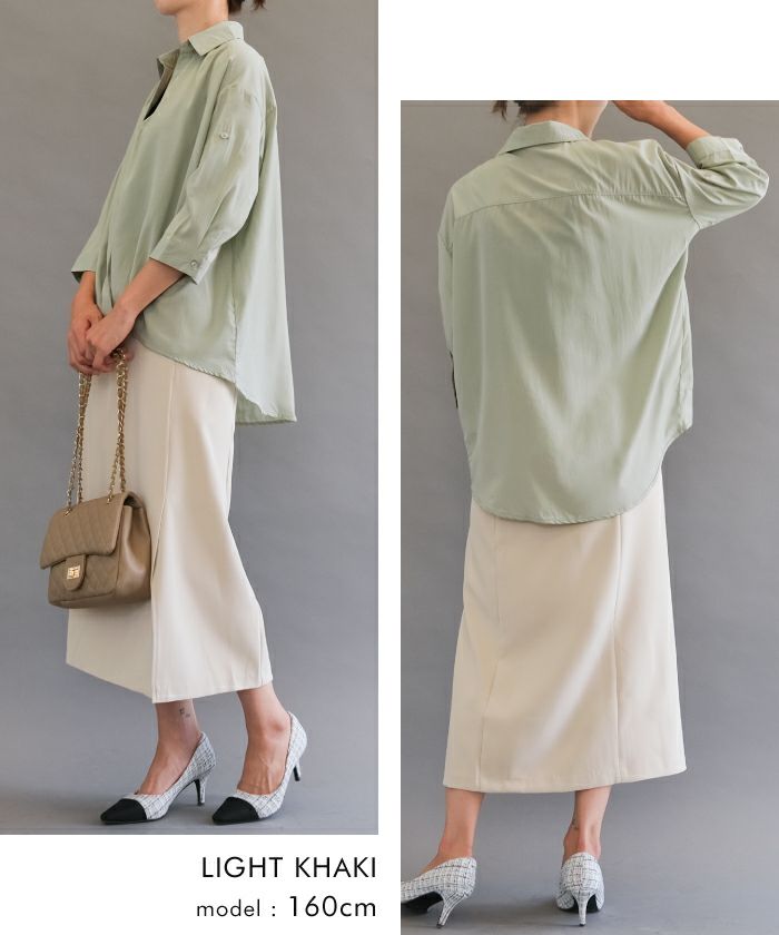 156cmライトカーキ購入。思っていたより少し暗めの落ち着いた色でした。サラサラしていて着心地が良いです。これから夏に向けてエアコンの効いた部屋では袖丈が調節できるのが嬉しいです。袖をロールアップするとかわいいです。