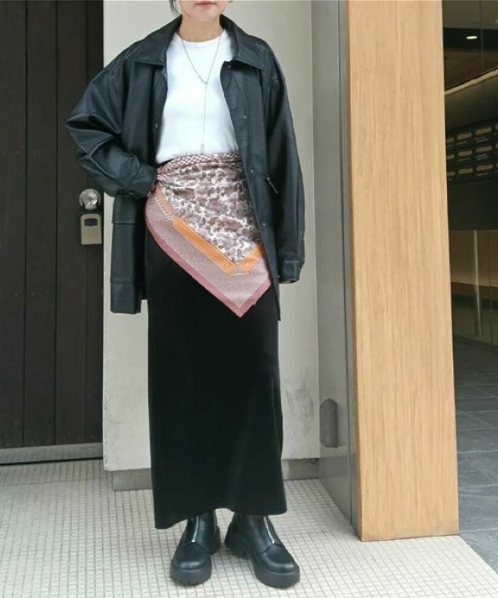 シンプルなモノトーンコーデにプラスするだけで、ぐっとトレンド感のある着こなしに。
