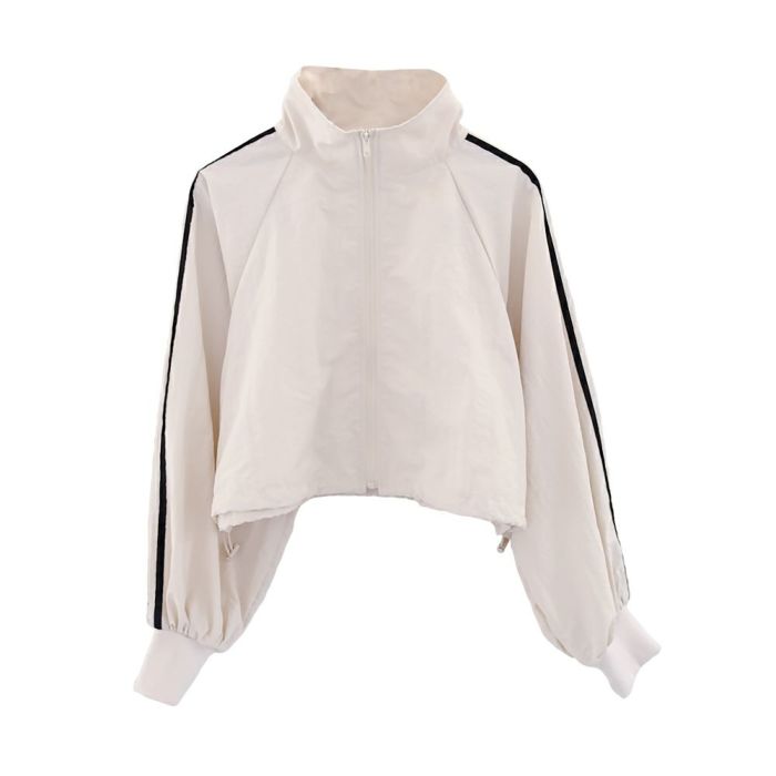 • コンパクトな丈感が大人可愛いナイロンサイドラインショートブルゾン サイドのラインデザインでスポーティー要素をプラス。 裾まわりのドロストで絞りを効かせてシルエットの変化を楽しめる、表情豊かな一枚! ショート丈でボトムスを選ばず、どんなスタイリングにも合わせやすい丈感です。