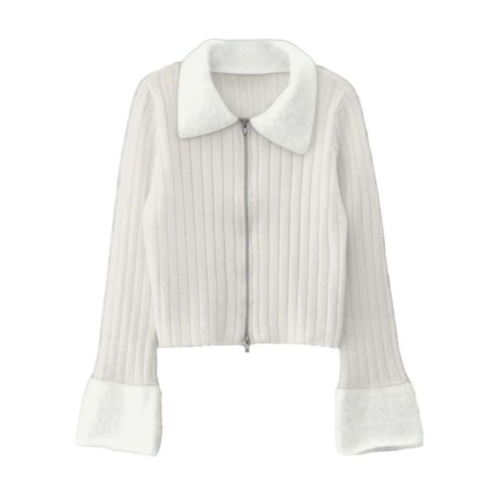 • フェザーヤーン素材を使用した襟付きのショート丈ダブルジップリブニットカーディガン