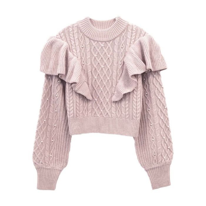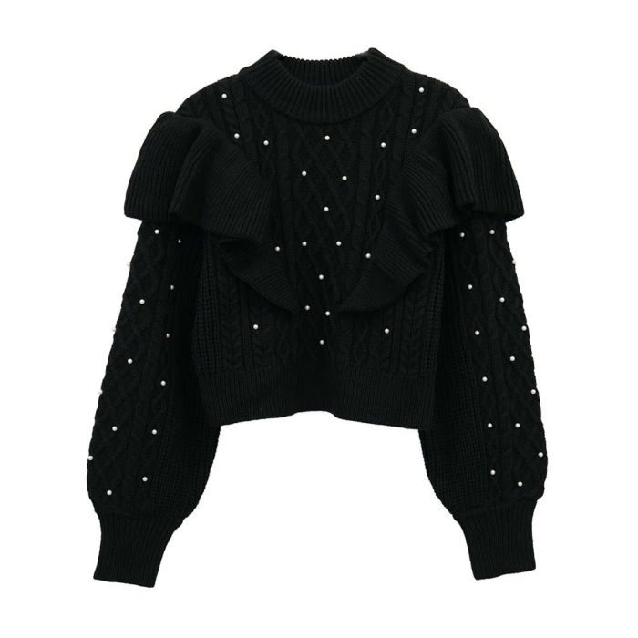 • 散りばめられたパールがシーズンムードを高めてくれるケーブルフリルパールニット