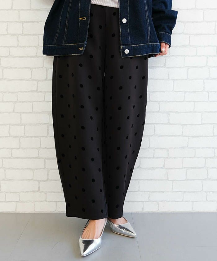 • フロッキープリントのドット柄が大人可愛いカーブパンツ。