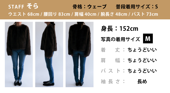 ふわふわとした質感が魅力のノーカラーファージャケット。