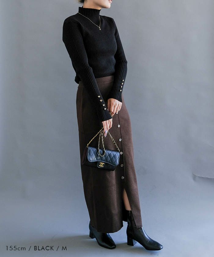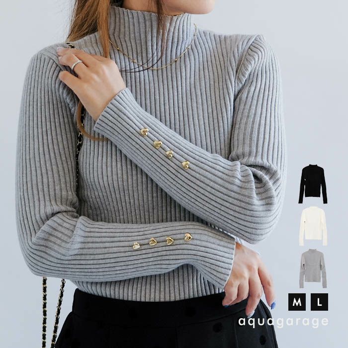 ハイネック袖ハートボタンリブニットトップス 春 秋 冬 M レディース ≪ゆうメール便配送30・代引不可≫ | | アクアガレージ aquagarage