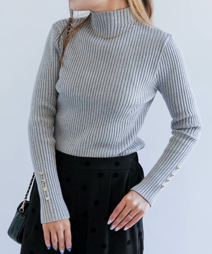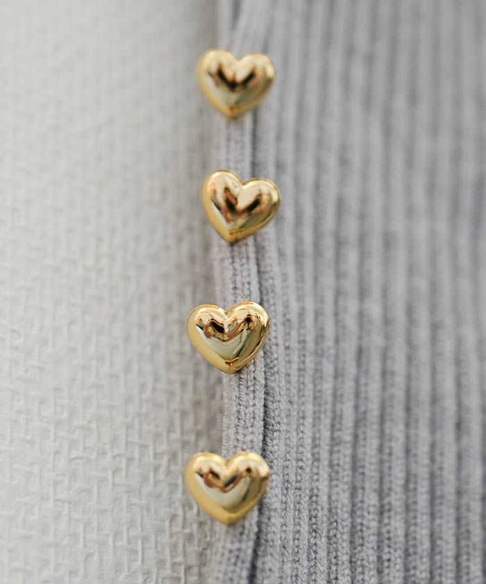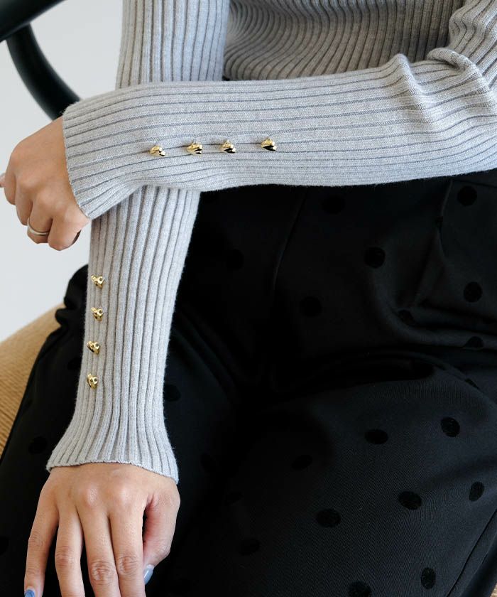 袖口に連なるハート型ボタンが視線を集める、遊び心のあるリブニットトップス。
