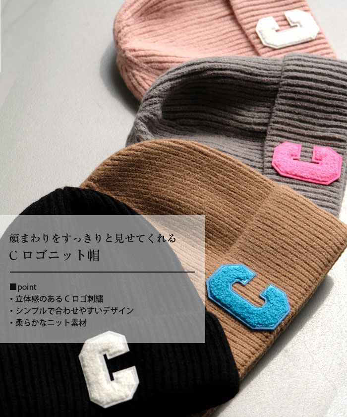 シンプルながらも、フロントにあしらわれた「Cロゴ」がアクセントになったニット帽。
