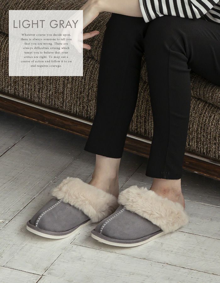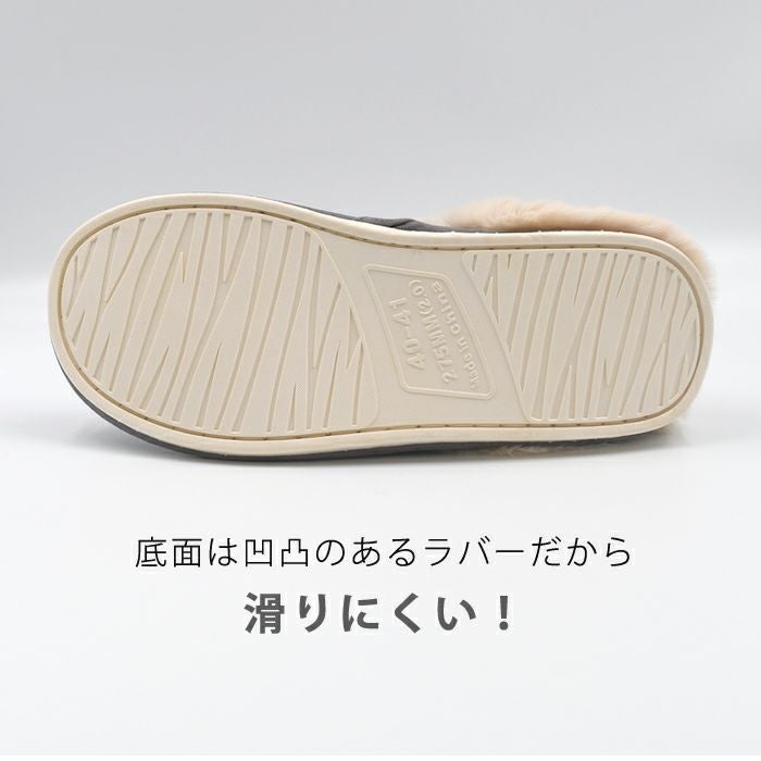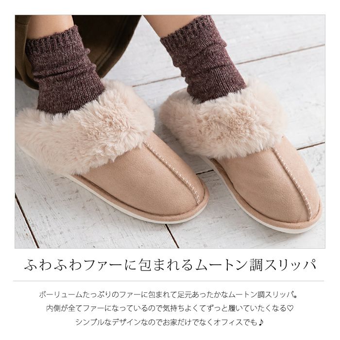 • ボリュームたっぷりのファーに包まれてあったかなムートン調スリッパ。