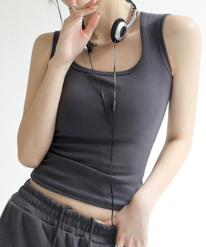 デコルテをきれいに見せるスクエアカットリブニットタンクトップ