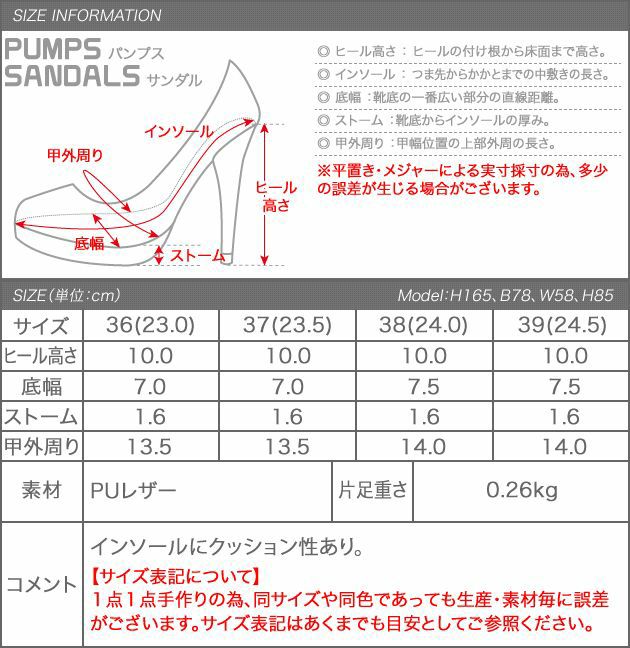 ヒール高さ:10.0cm 底幅:7.0cm ストーム:1.6cm 甲外回り:13.5cm