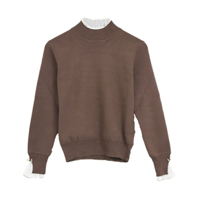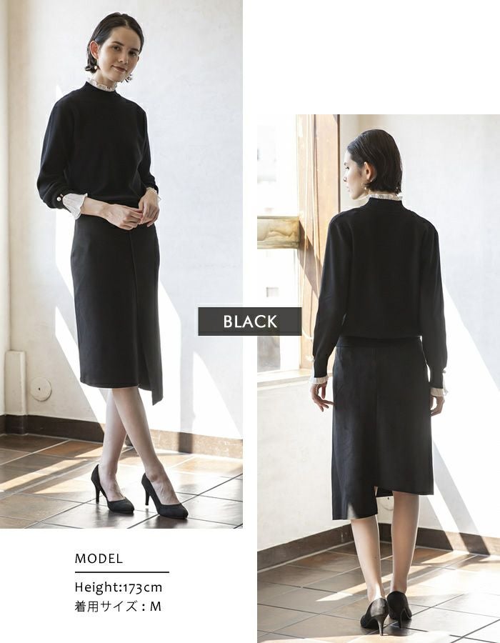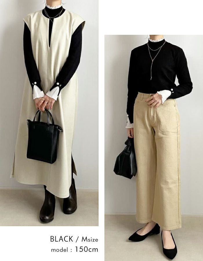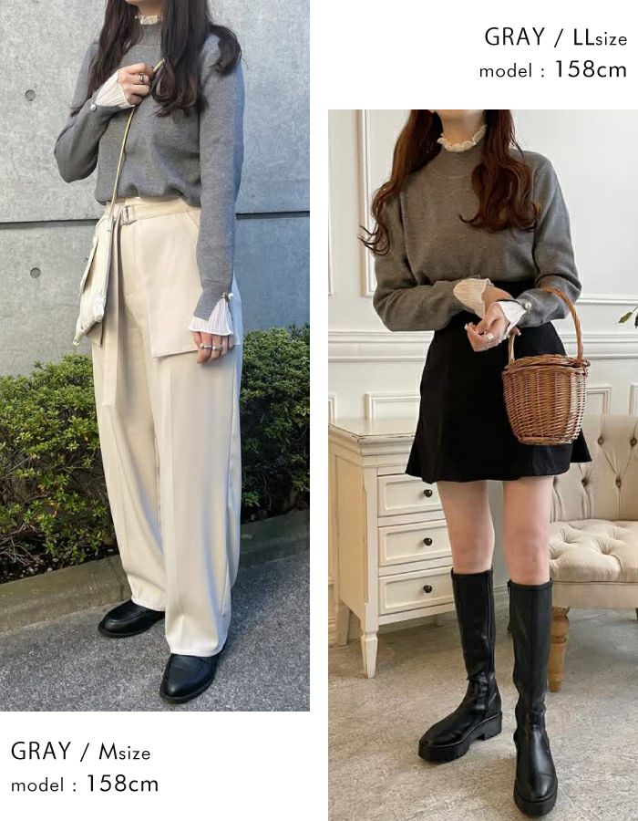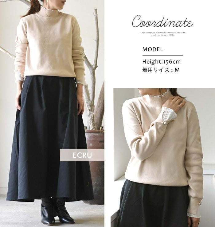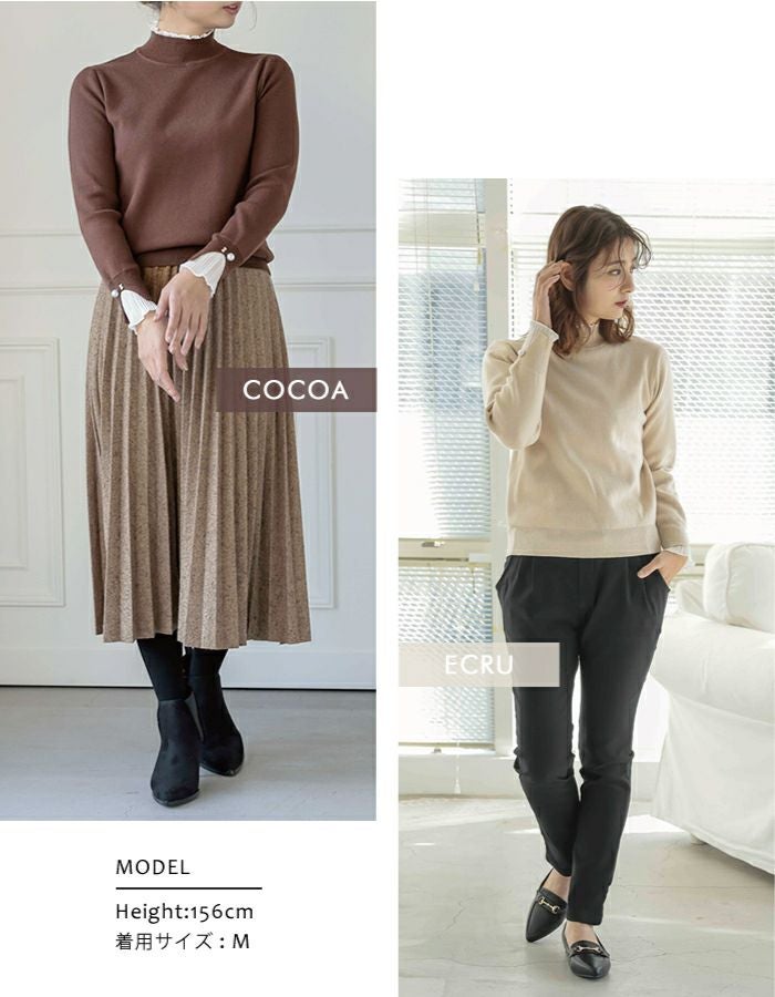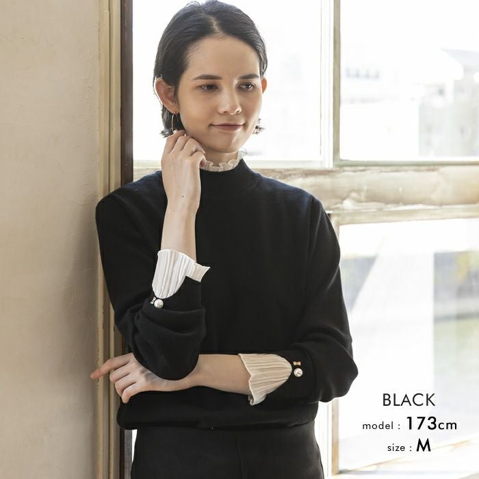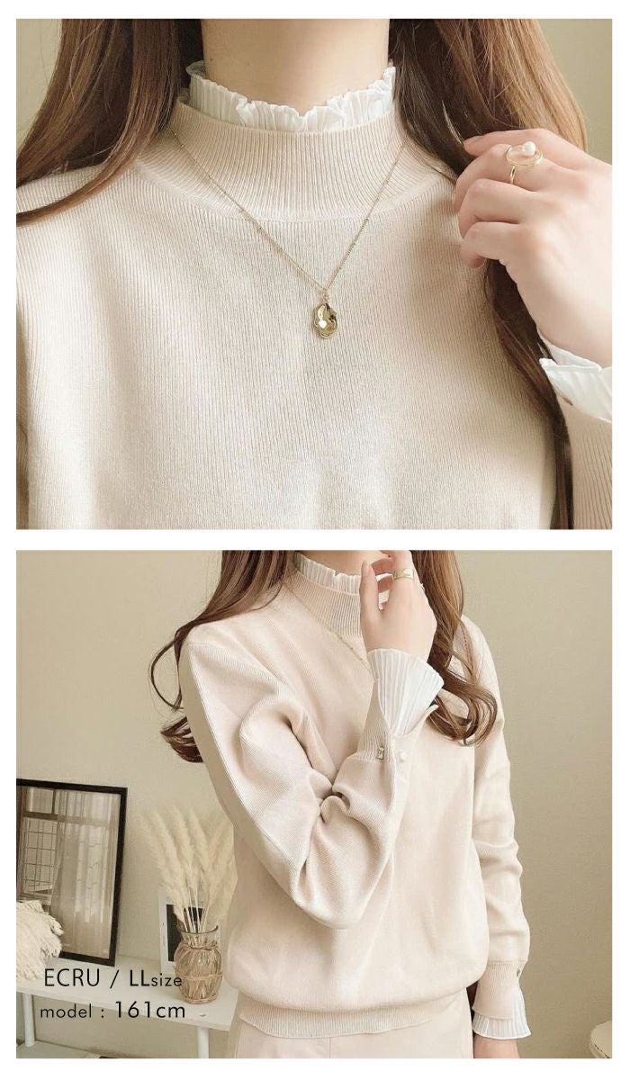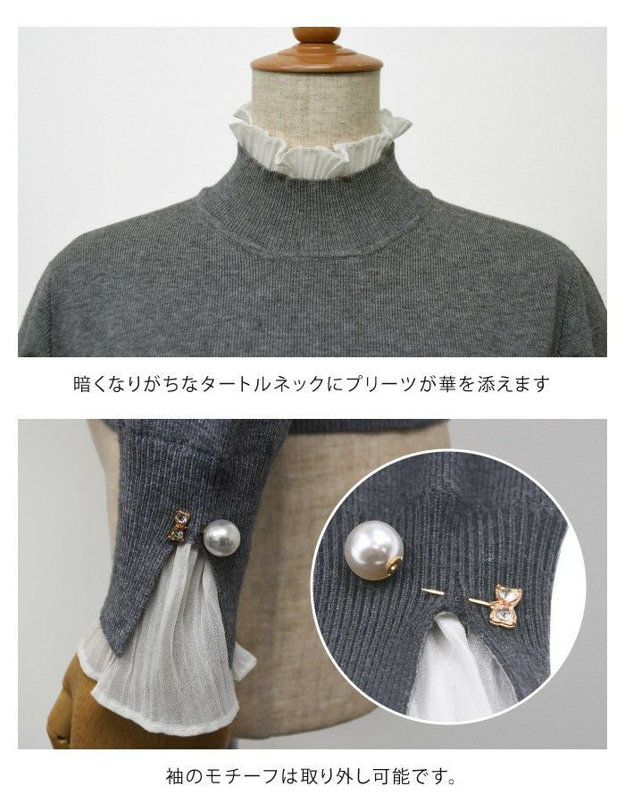 ニット トップス レディース 秋 冬 長袖 M L 袖口プリーツ 襟元プリーツ 袖口フリル 襟元フリル シンプル セーター きれいめ フェミニン 上品 清楚 ハイネック ボトルネック ハイゲージ レイヤード風 重ね着風 異素材 フェイクレイヤード 20_02wrkt■