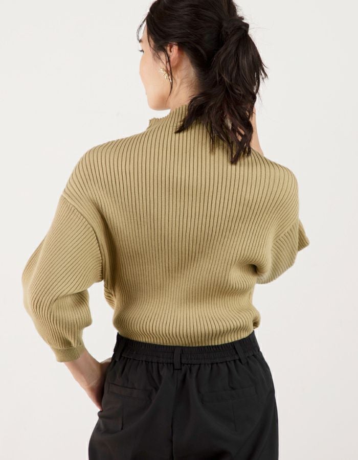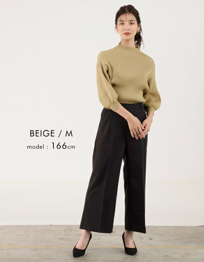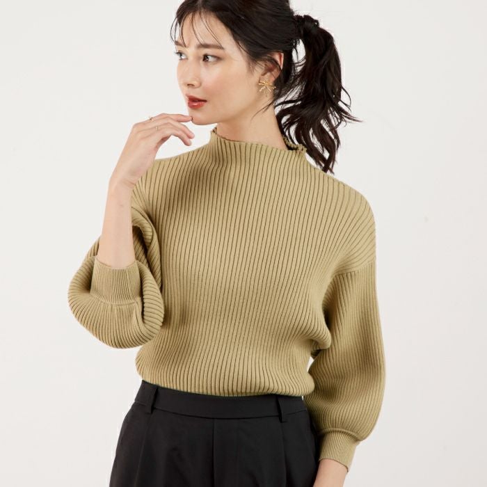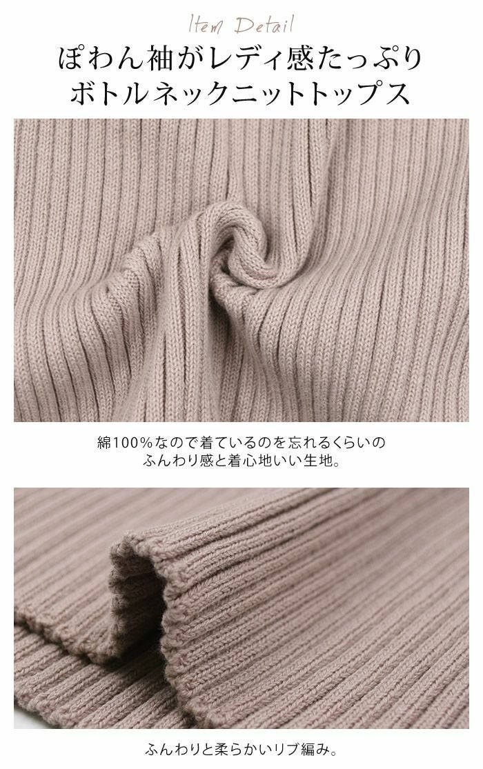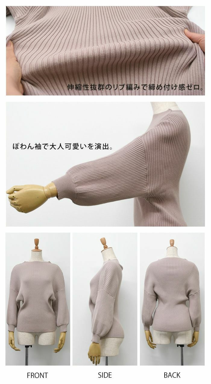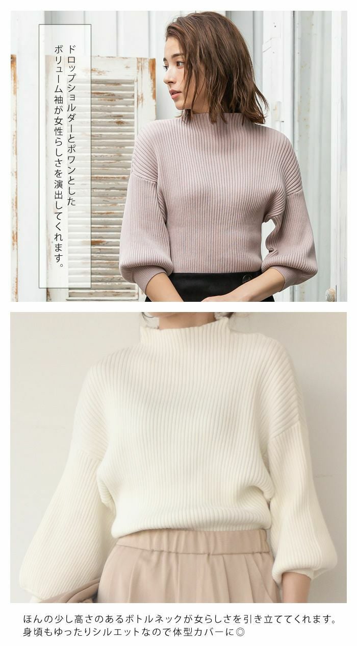 リブニット トップス レディース 春 秋 冬 7分袖 七分袖 八分袖 8分袖 M L ボリュームスリーブ ボリューム袖 バルーンスリーブ バルーン袖 ぽわん袖 ポワン袖 パフスリーブ ボトルネック 二の腕カバー シンプル ゆったり リラックス 華奢見せ 細身 タイト 細見え スタイルアップ きれいめ フェミニン 上品 清楚 20_02wrkt■