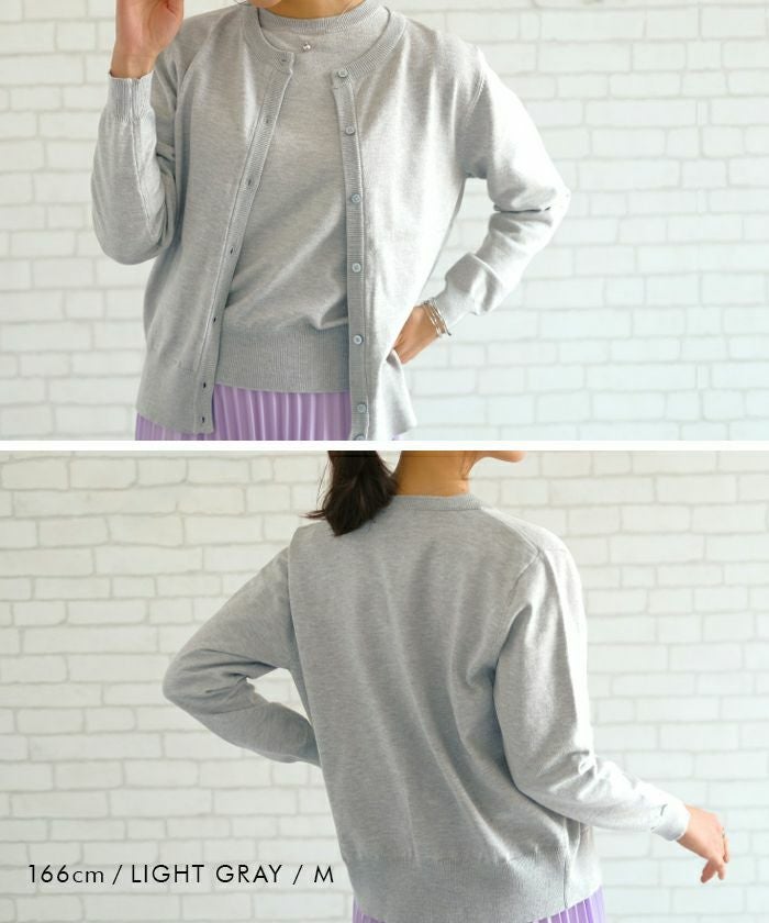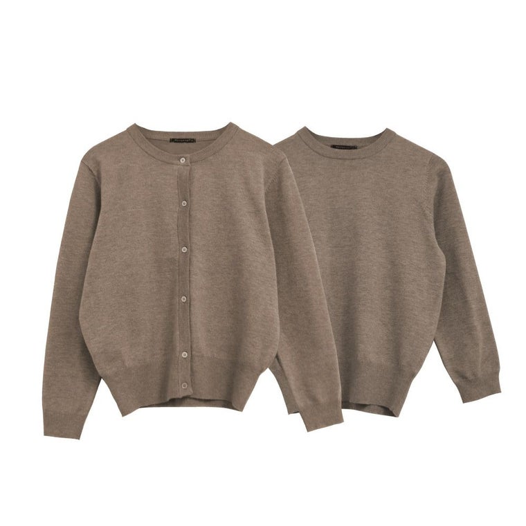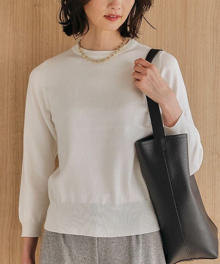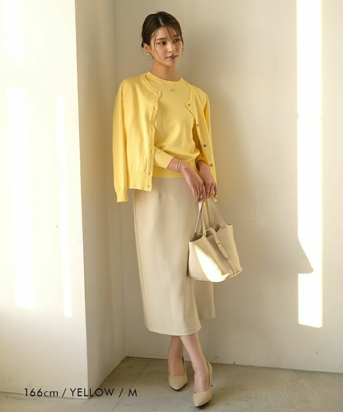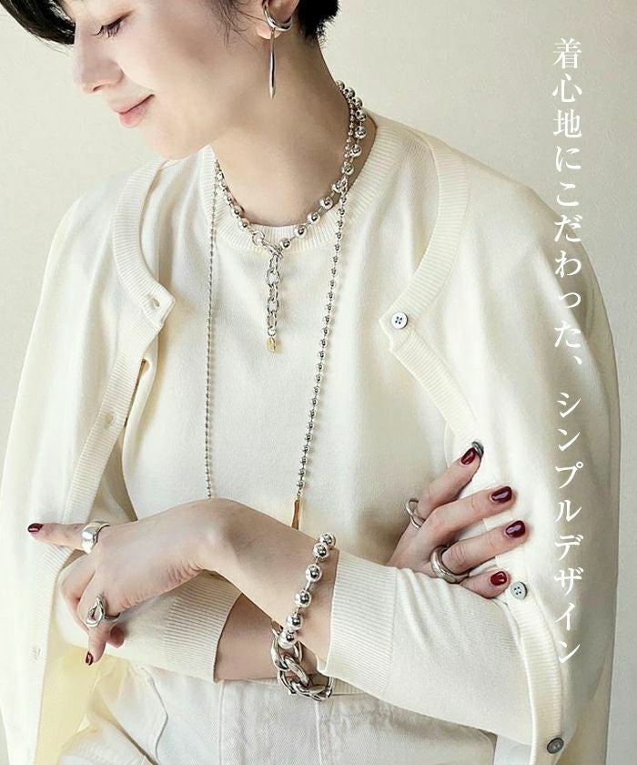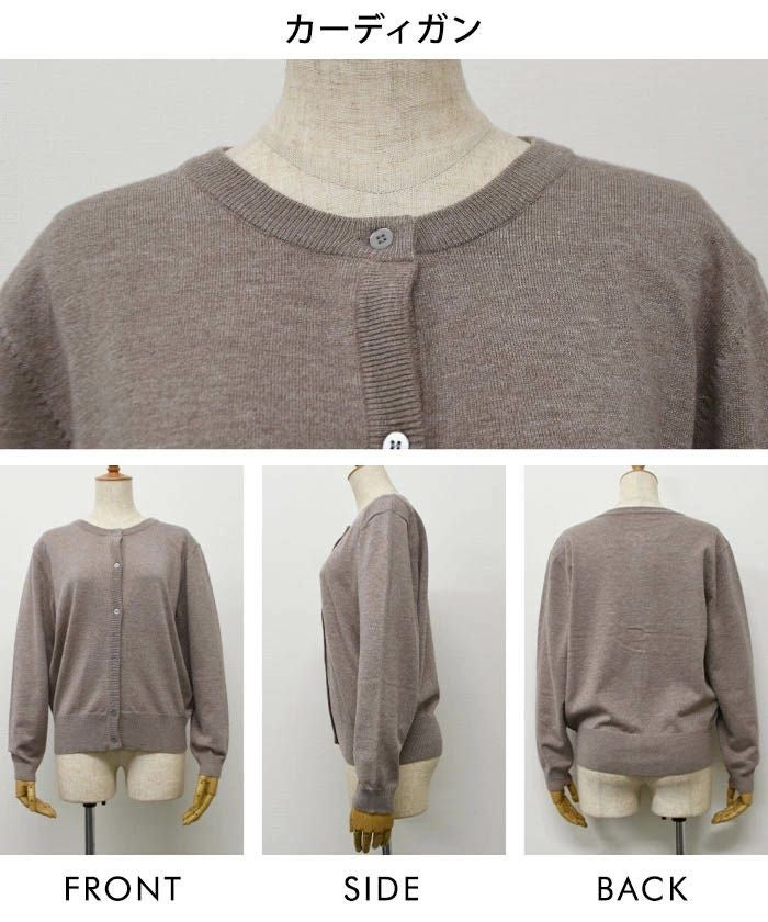 • ハイゲージニットで上品なカーディガンと、クルーネックのシンプルな八分袖ニットがセットのアンサンブル。 単品使いも可能で自由な着こなしが楽しめるアイテム。